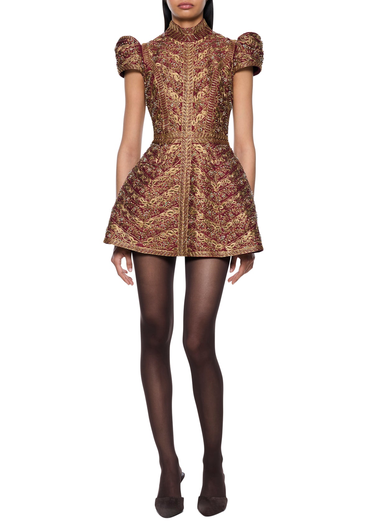 Engineering and artistry converge in intricate metalwork and architectural silhouettes. Hand-embroidered metallic elements transform garments into contemporary suits of armour, while structured designs pay homage to Renaissance craftsmanship. Metallic lace and intricate beadwork evoke the opulence of Italian courts, each pattern meticulously crafted through countless hours of handwork.