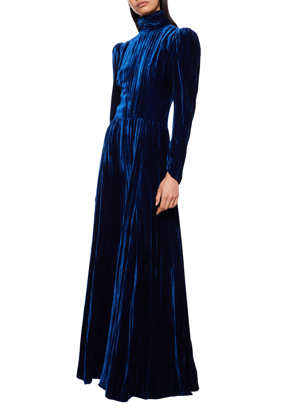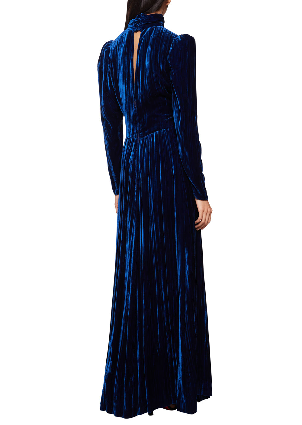 This vintage 1930s Navy gown, in an elegant crushed velvet features a high neck line with raised capped shoulders and keyhole detailing at the back of the neck.