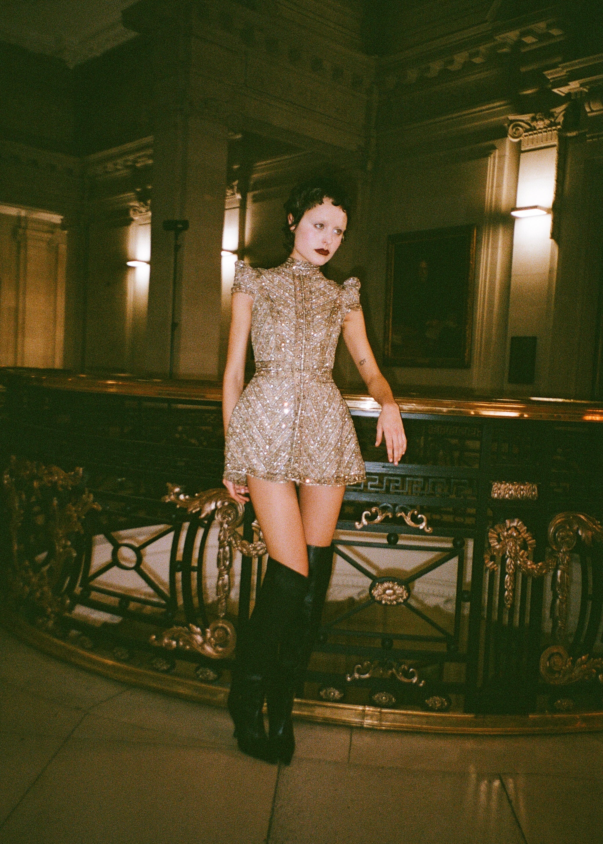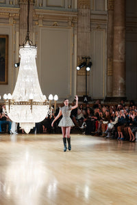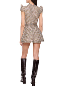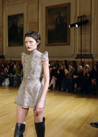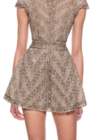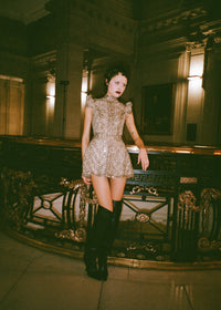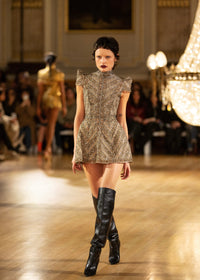 The Celestius Mini Dress is one of the highest forms of couture handwork with hand made metallic lace adorned with crystal glass rhinestones. The design echos the bold geometry and artistry of Florence’s architectural masterpieces. Taking inspiration from Leonardo Di Vinci's studies of proportion and form, each line of beading has been meticulously placed to create a harmonious pattern that catches light from every angle.