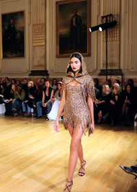 The Cosimo Dress draws inspiration from the Renaissance-era fascination with astronomy and its influence on art and design, the dress features heavy hand embellishment mirroring a constellation of stars.