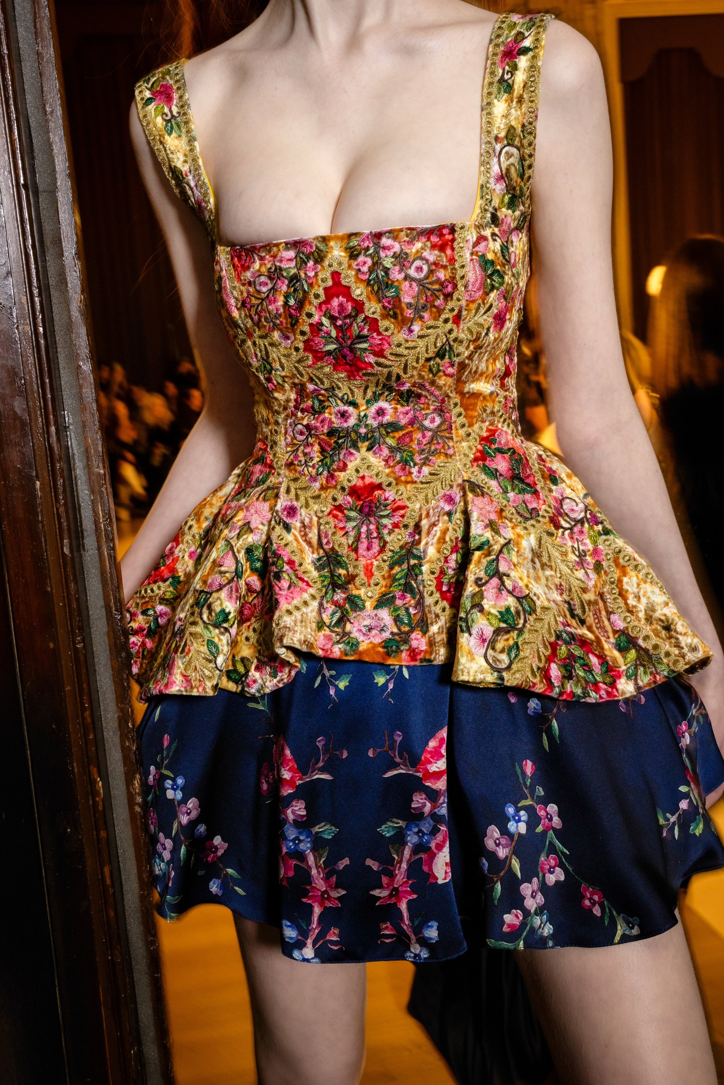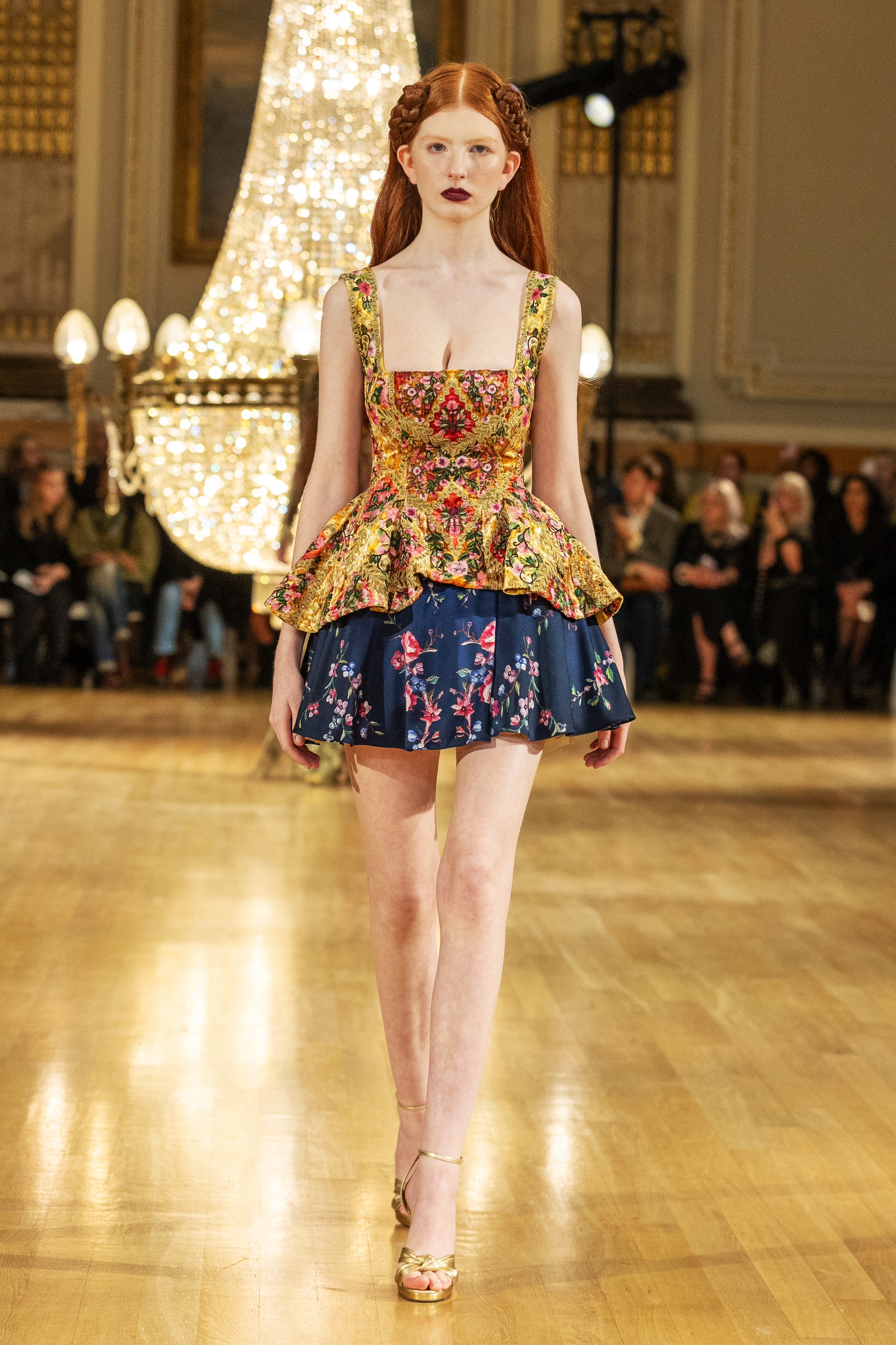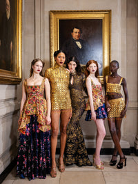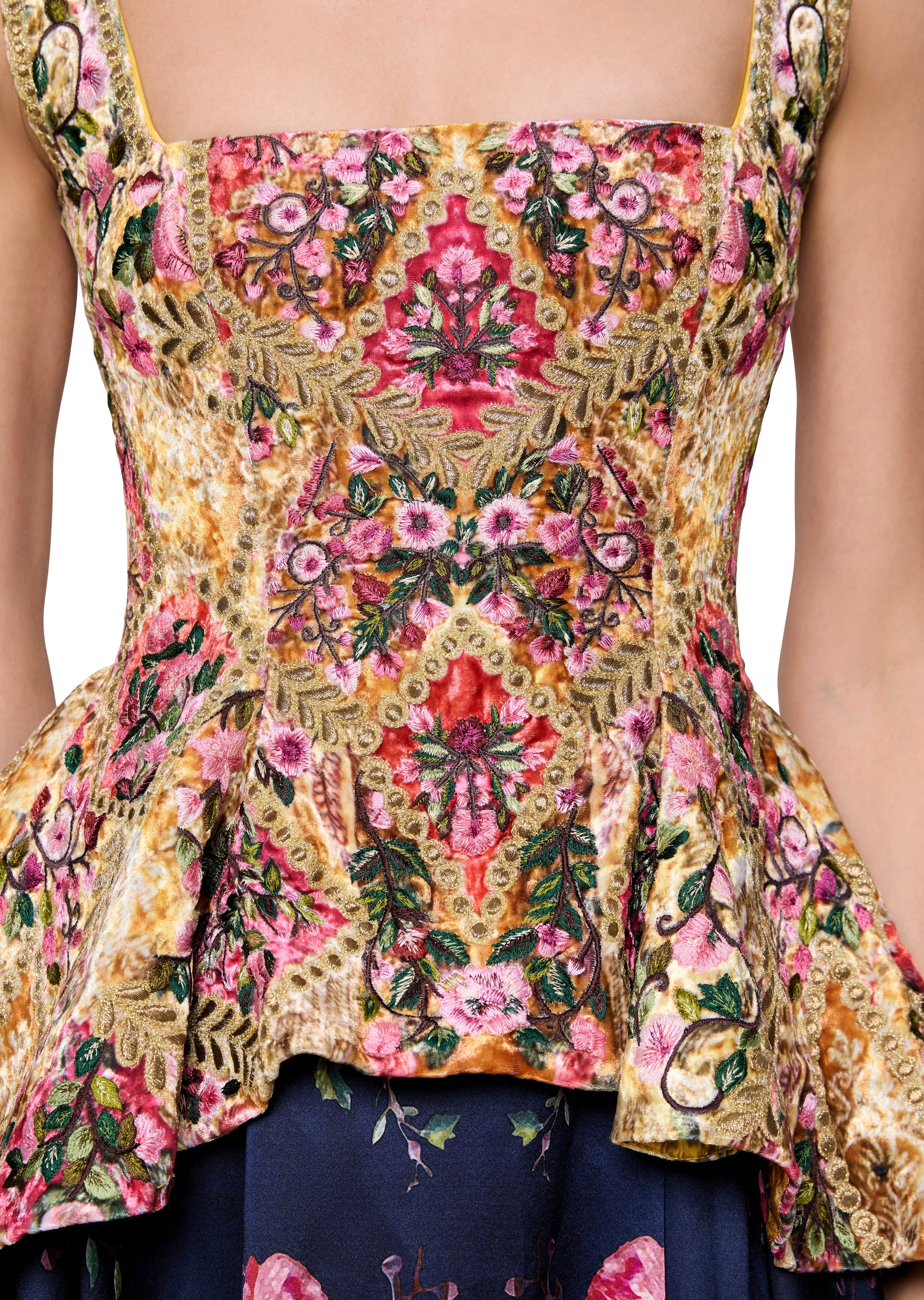 The Di’Vinci Dress, in printed velvet, features embroidered highlights with hand-dyed thread, enhancing the floral motifs with an artisanal touch. Gilded accents create a luminous patchwork effect, reminiscent of opulent Renaissance textiles.