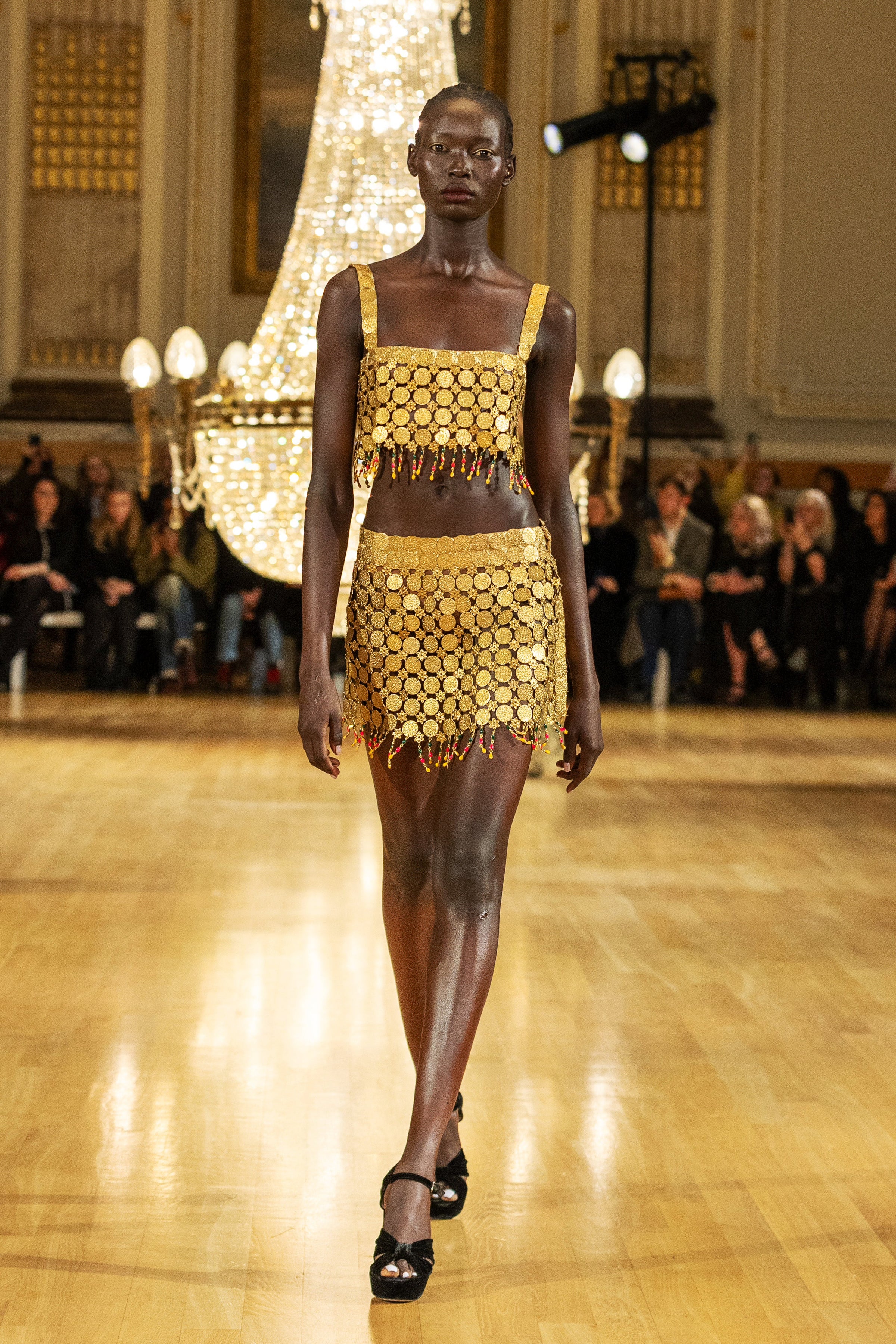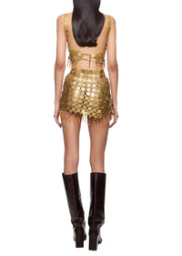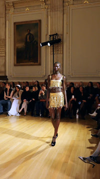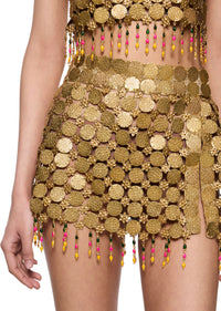 This intricate metalwork technique showcases a mesmerising tapestry of ornate golden discs and floral motifs, meticulously linked together in a rhythmic pattern in celebration of Ghiberti's masterwork. Colourful enamel fringing cascades from the hem in vibrant pink and yellow adding contrast and movement, an adjustable waist allows the Skirt to be worn high on the waist or to have a looser fit on the hips.