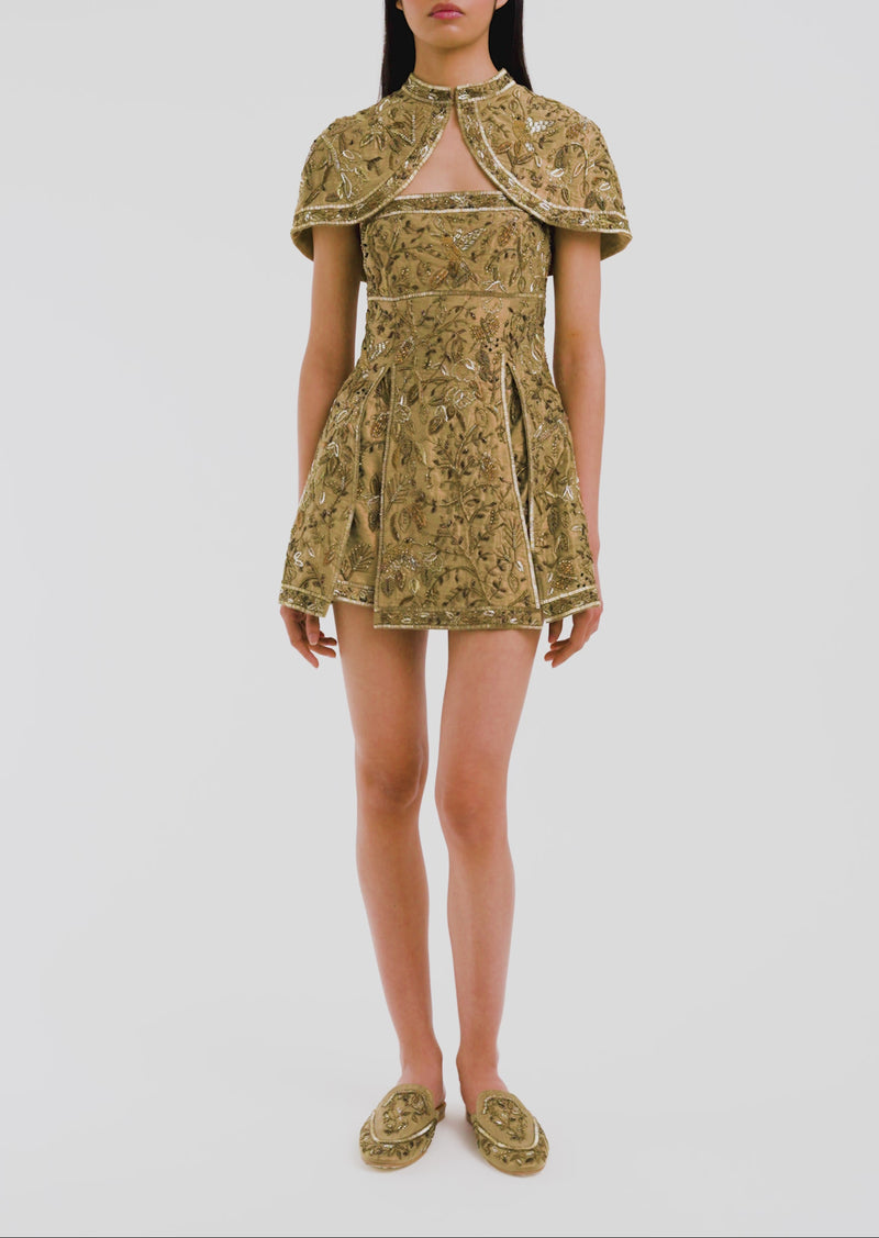 Botanical motifs of flowers and vines, birds and butterflies wind across the surface in antique gold, catching the light with every movement. Worn alone or layered over the Honey Empire Mini or Gown, it completes the collection with the same playful precision that defines the Honey world.