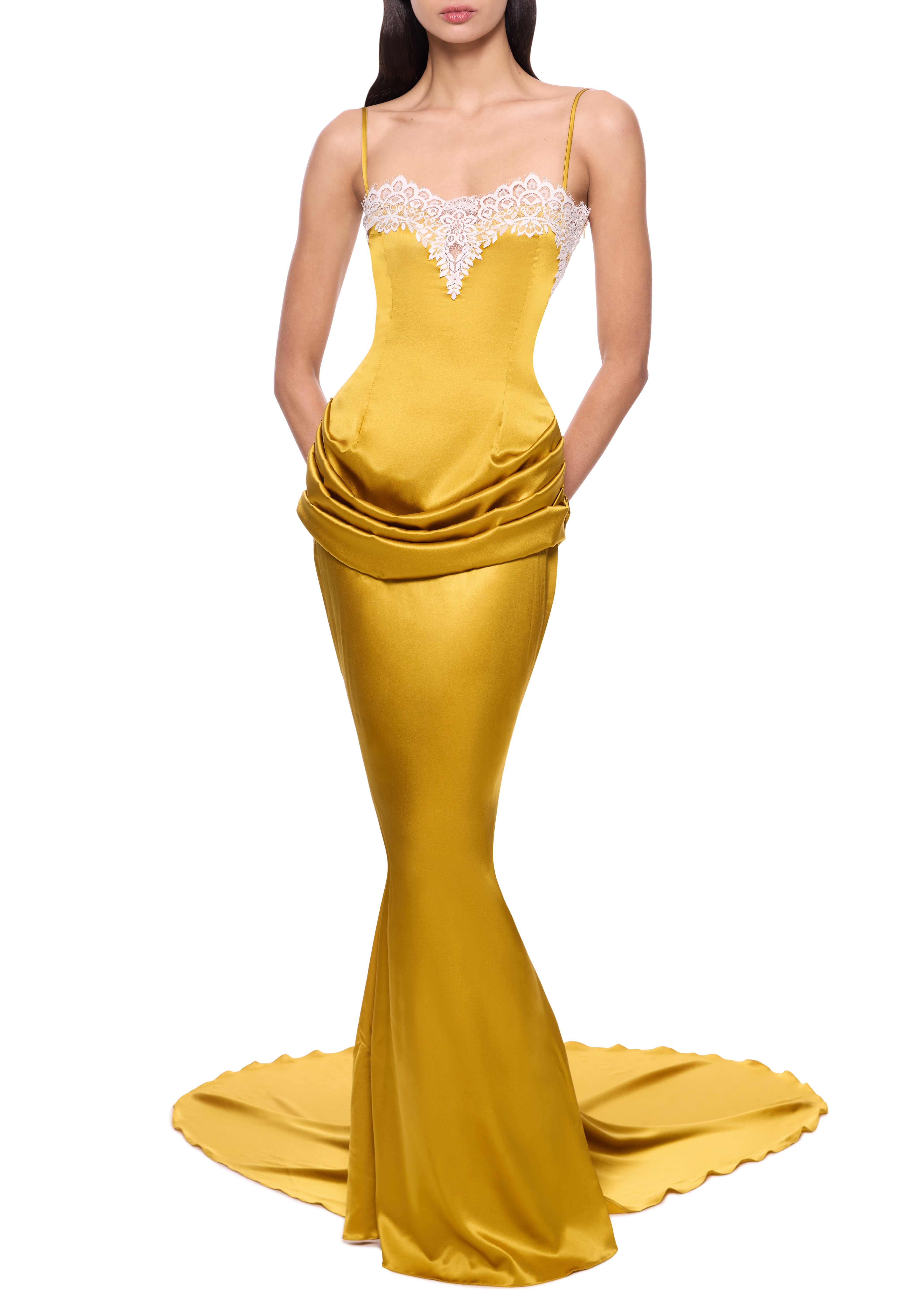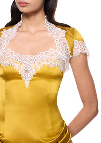 The Silk Iris Bolero is inspired by the romanticism of 15th-Century Italy, drawing from the gothic motifs and grand architecture of the Renaissance. Crafted from flowing Italian silk satin, this lightweight fabric drapes effortlessly over the shoulders, creating a sleek silhouette with intricate Lace trim detailing.