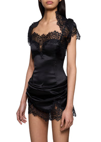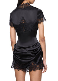 The Iris Bolero is inspired by the romanticism of 15th-Century Italy, drawing from the gothic motifs and grand architecture of the Renaissance. Crafted from flowing Italian silk satin, this lightweight fabric drapes effortlessly over the shoulders, creating a sleek silhouette with intricate Lace trim detailing.