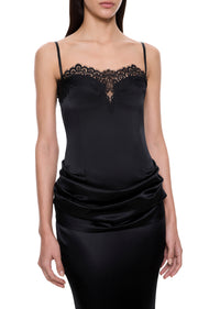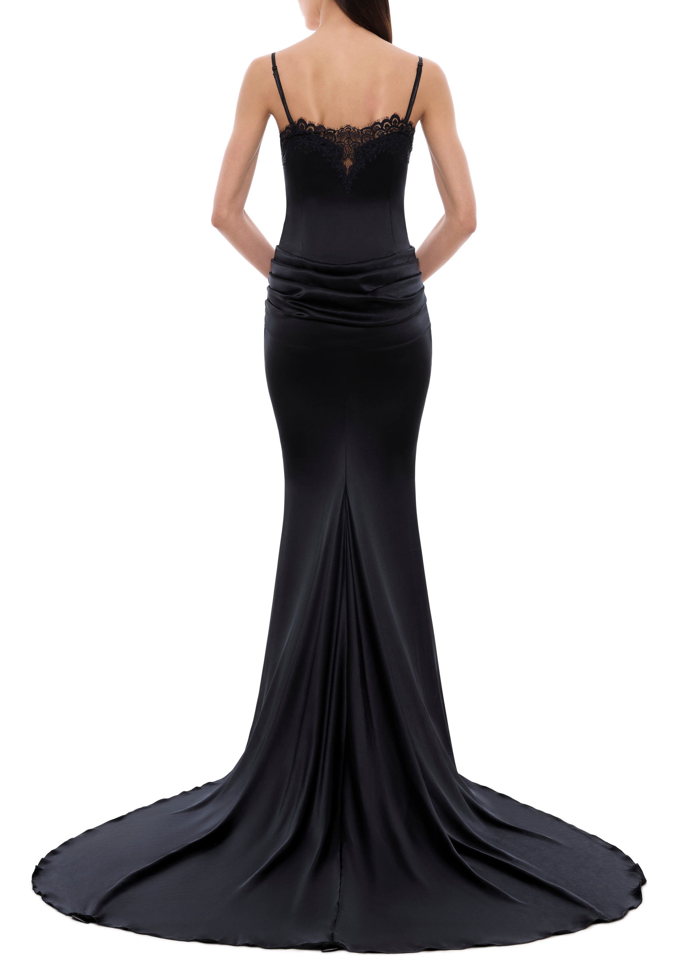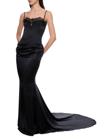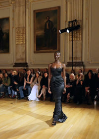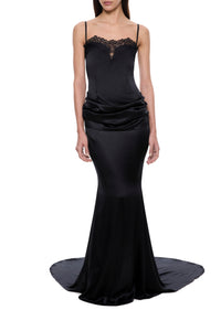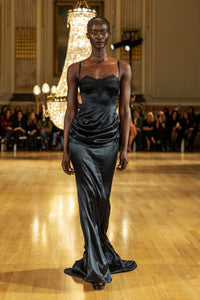 The Iris Gown is inspired by the romanticism of 15th-century Italy, drawing from the gothic motifs and grand architecture of the Renaissance. Featuring a deep, sculpted neckline, the design echoes the structured bodices of the era, elegantly framing the décolletage. Crafted from flowing black satin, its lightweight fabric drapes effortlessly, creating a sleek silhouette that enhances the body’s natural curves.