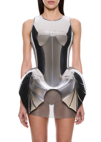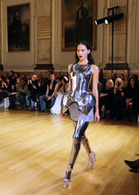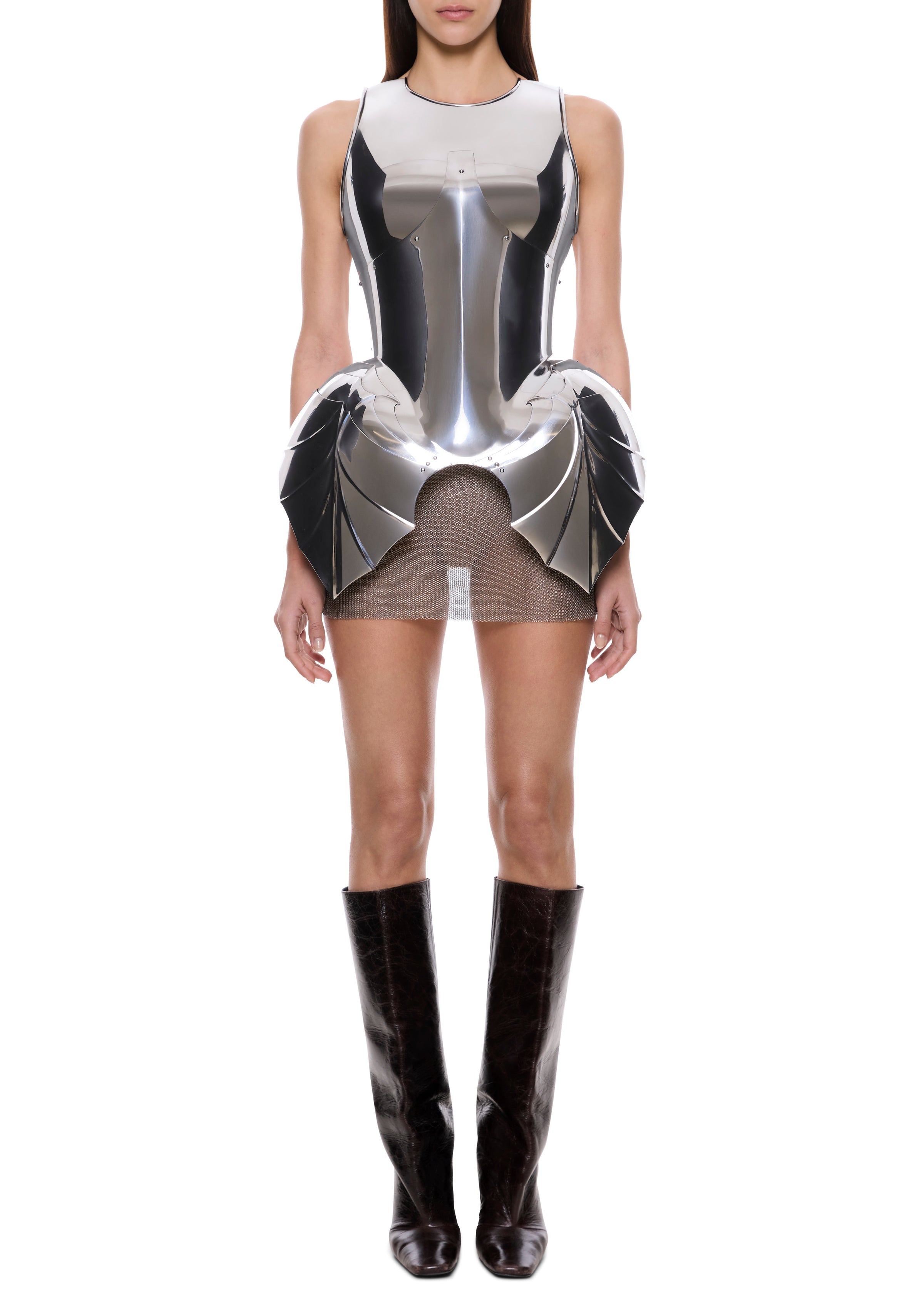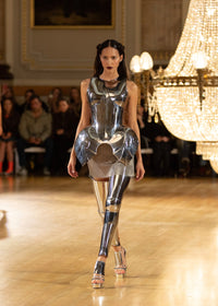 Completely hand-made in England, this sculptural form features architectural hip extensions crafted from steel. This piece captures the strength and defiance of its historical muse while creating a bold statement through its mirror-finish surface that dramatically reflects light. The armour-inspired garment embodies artistic vision and feminine power.