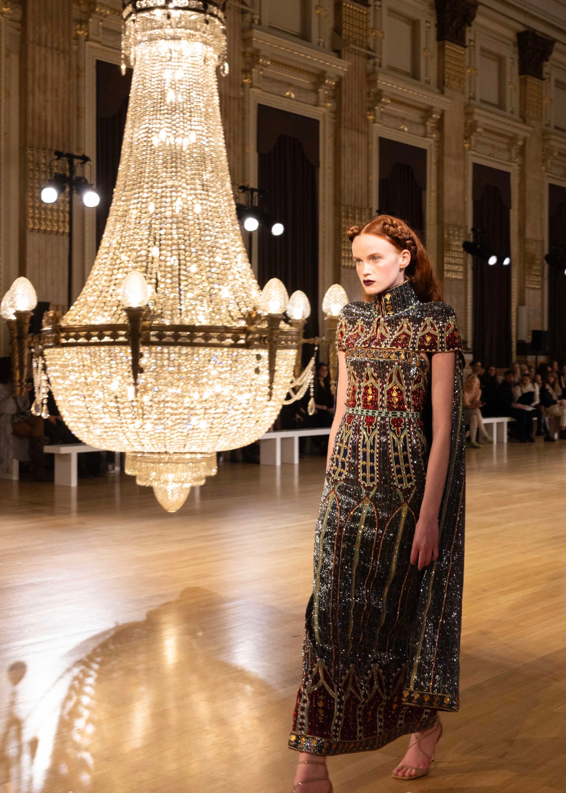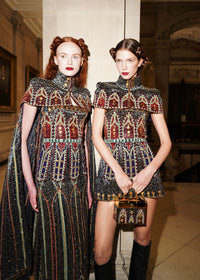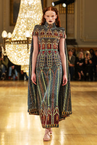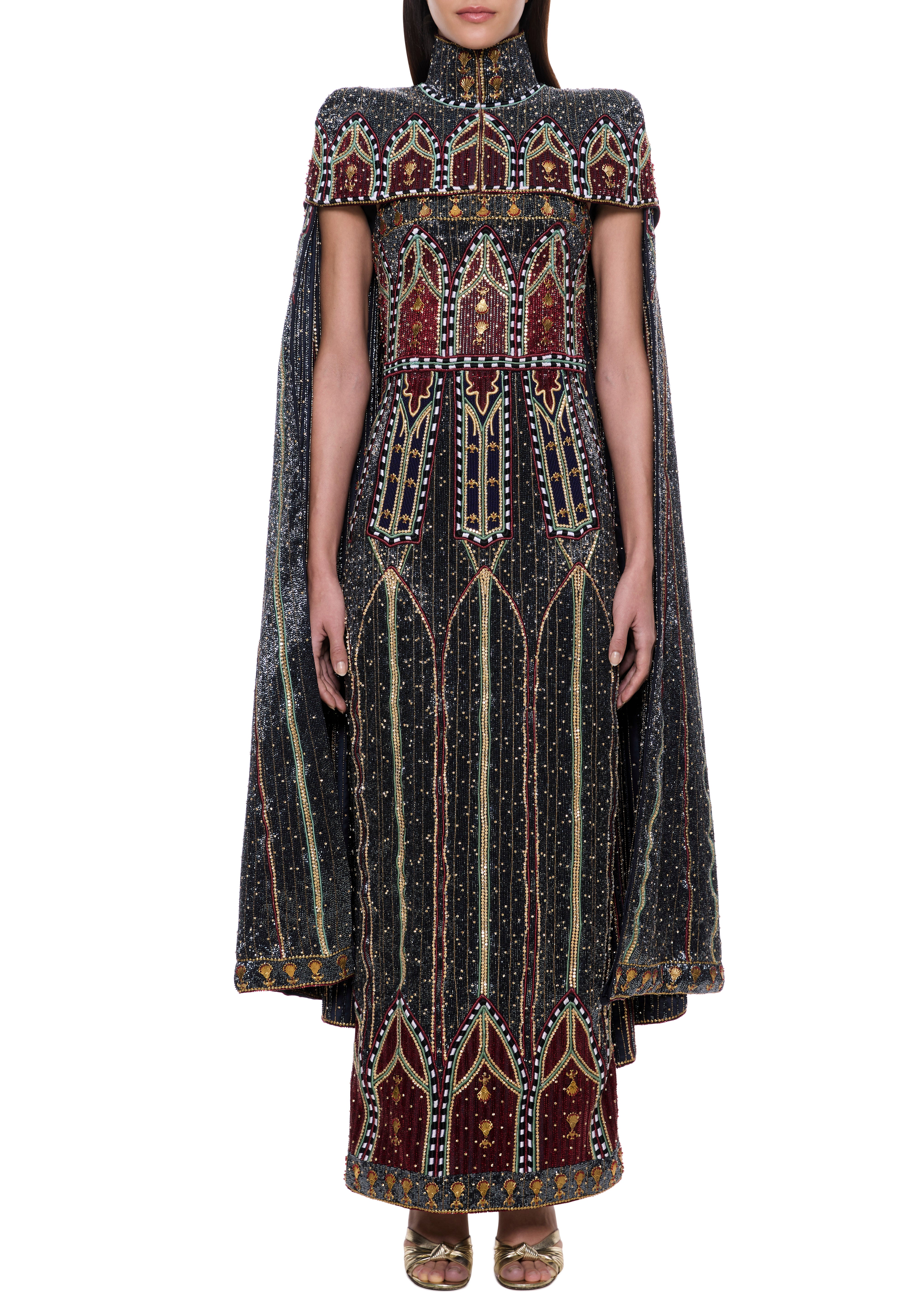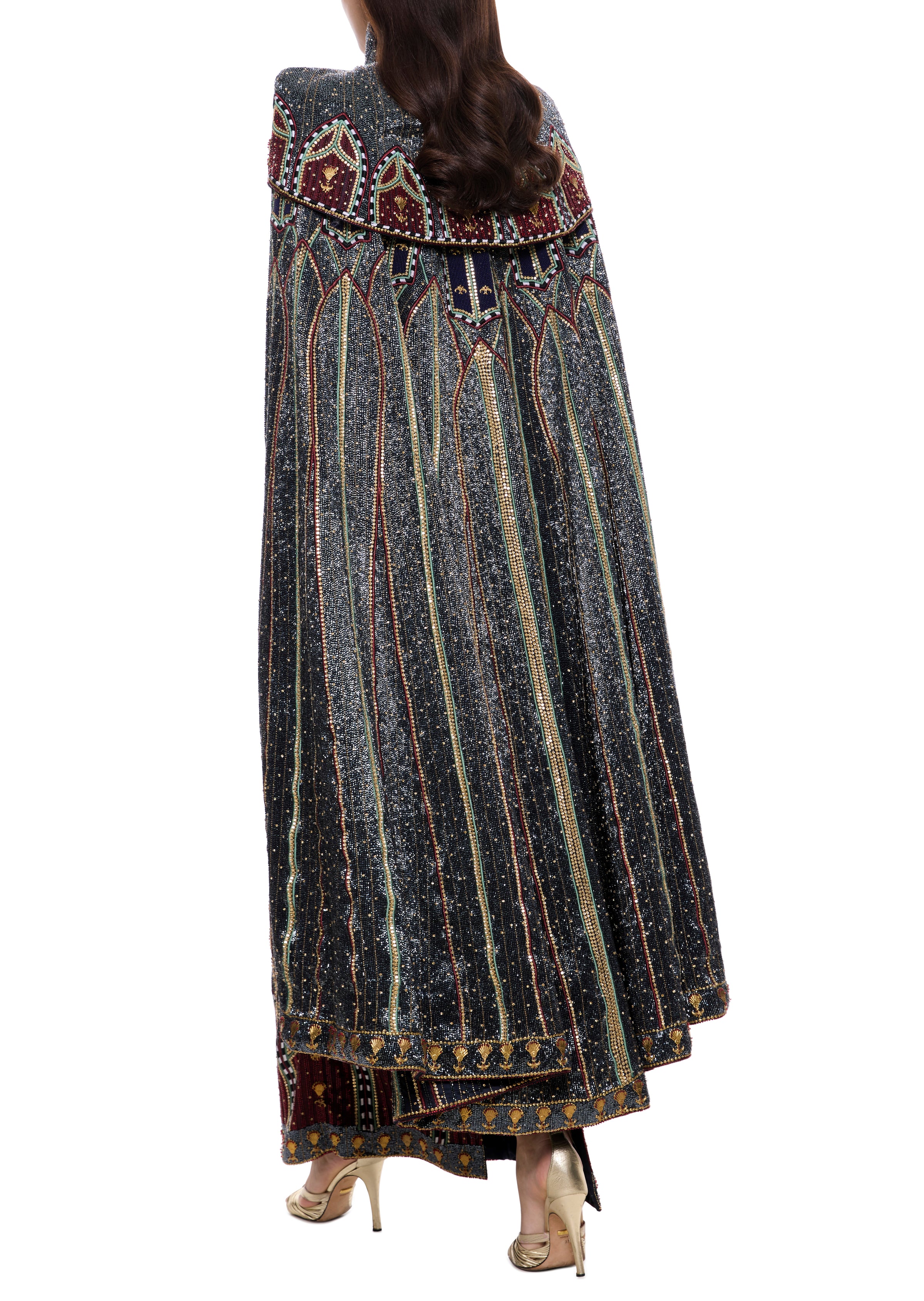 Drawing inspiration from the indomitable spirit of Joan of Arc, the Joan of Arc Cape transforms sacred grandeur into wearable art. The intricate beadwork in each panel mirrors the elaborate stained glass windows and vaulted arches of medieval architecture, while rich burgundy and midnight hues evoke the powerful presence of history's most celebrated warrior saint.