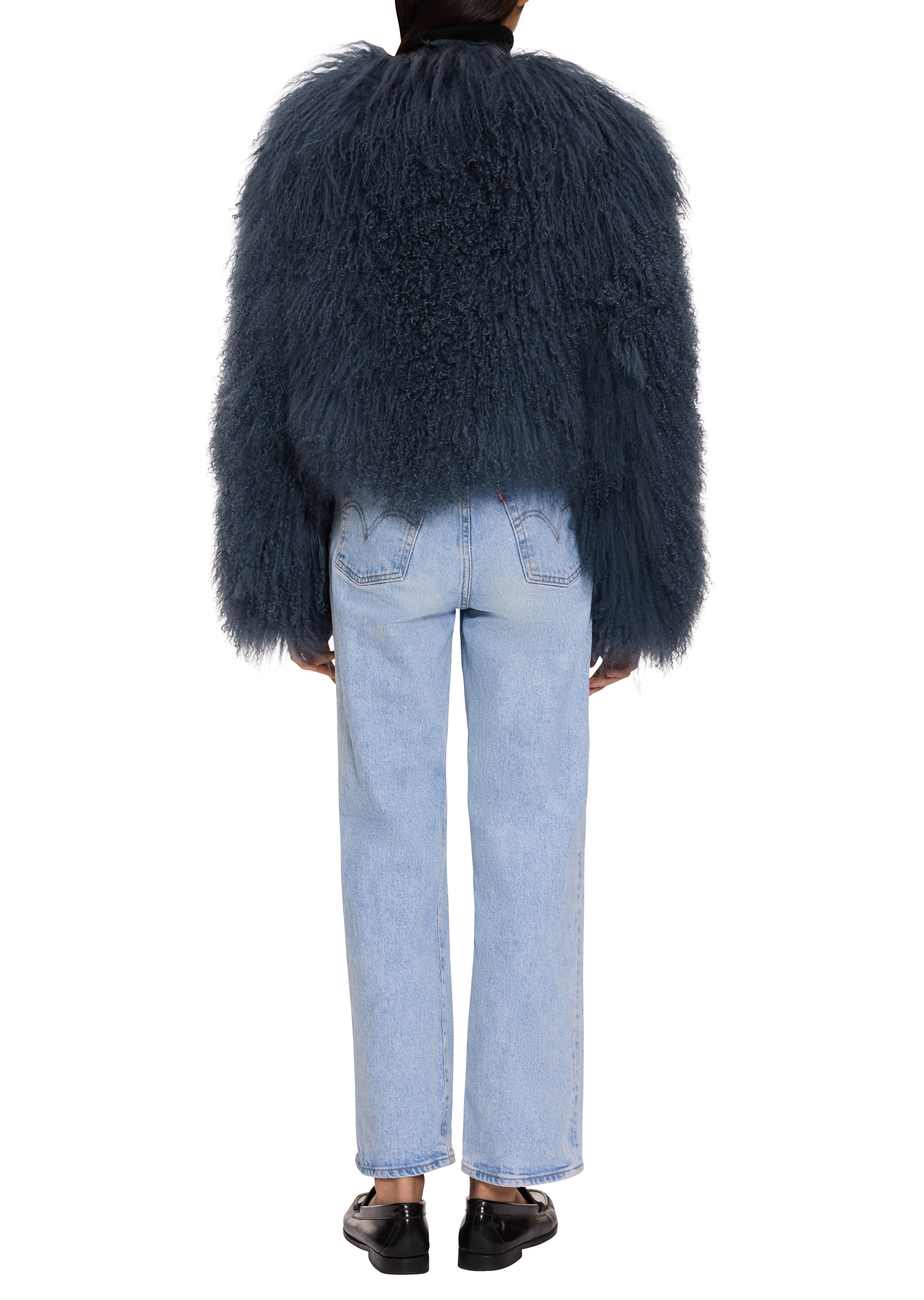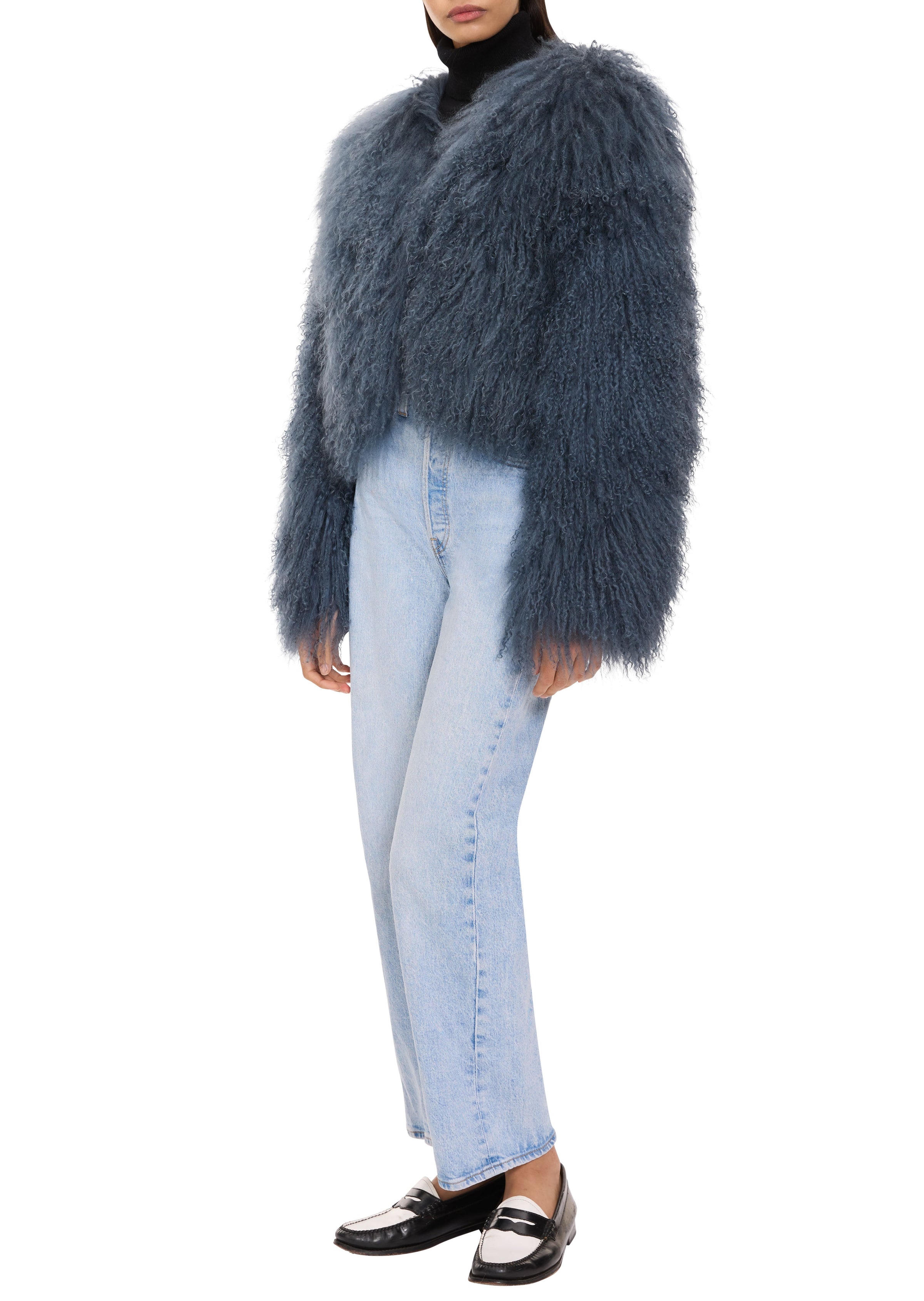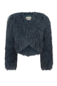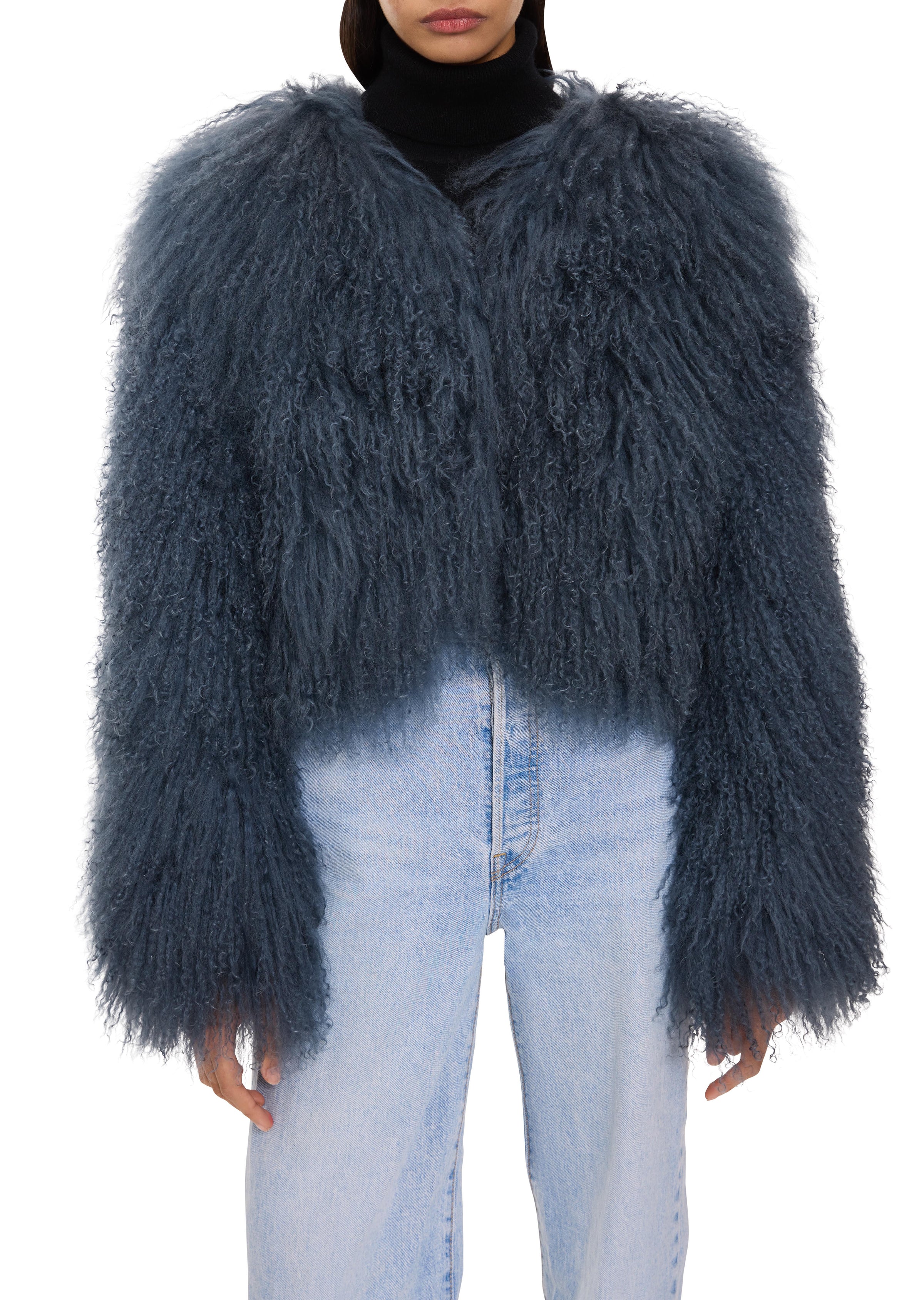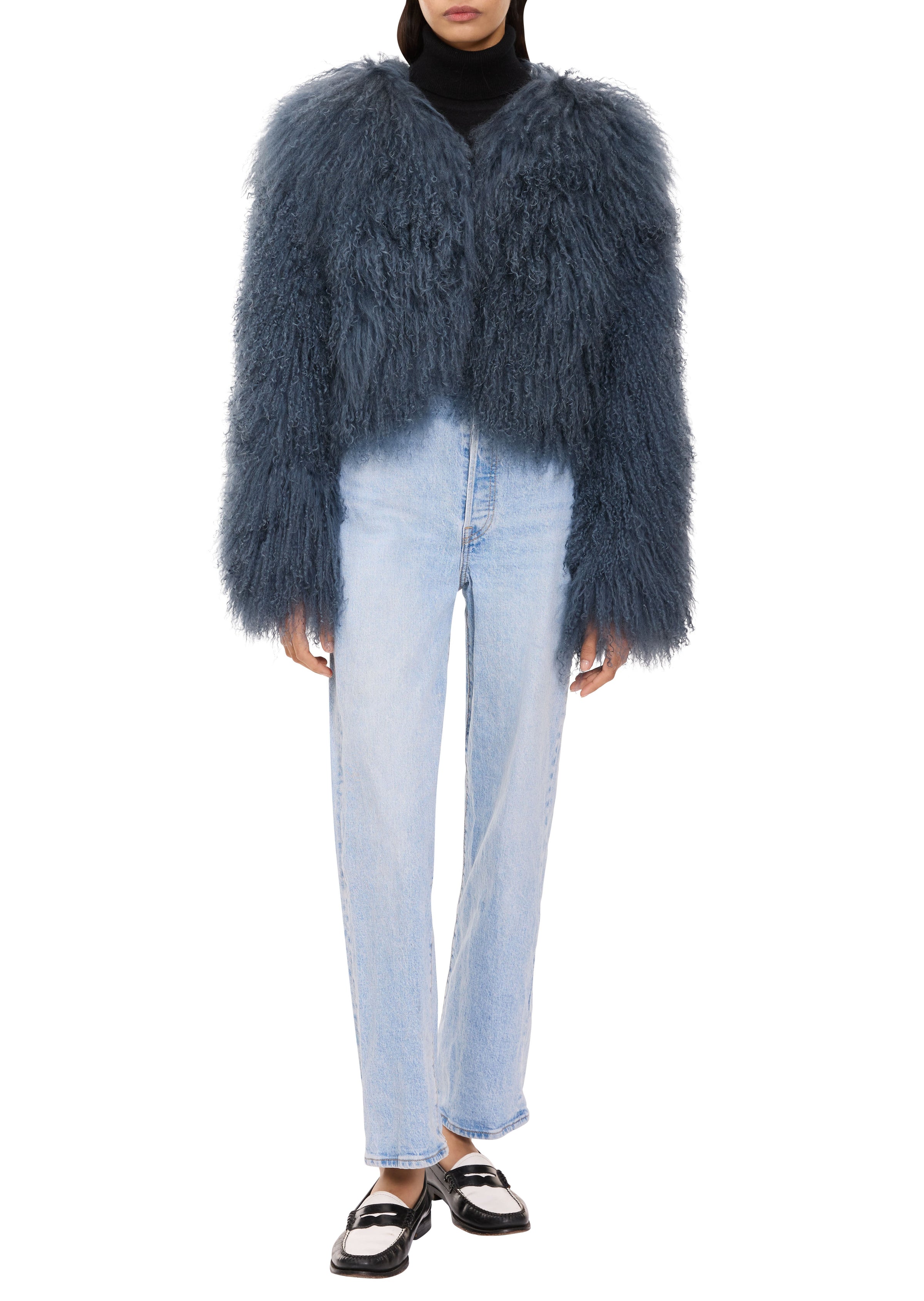 Crafted from textured Mongolian and detailed with a hidden hook and eye closure, this jacket is cropped at the waist for a fashionable fit.