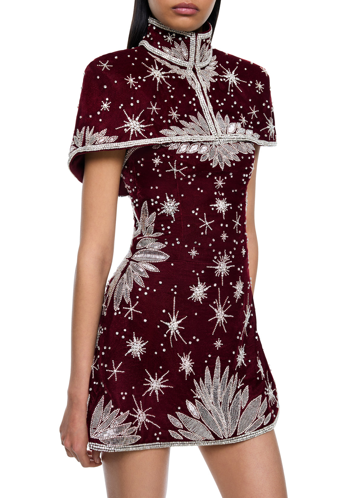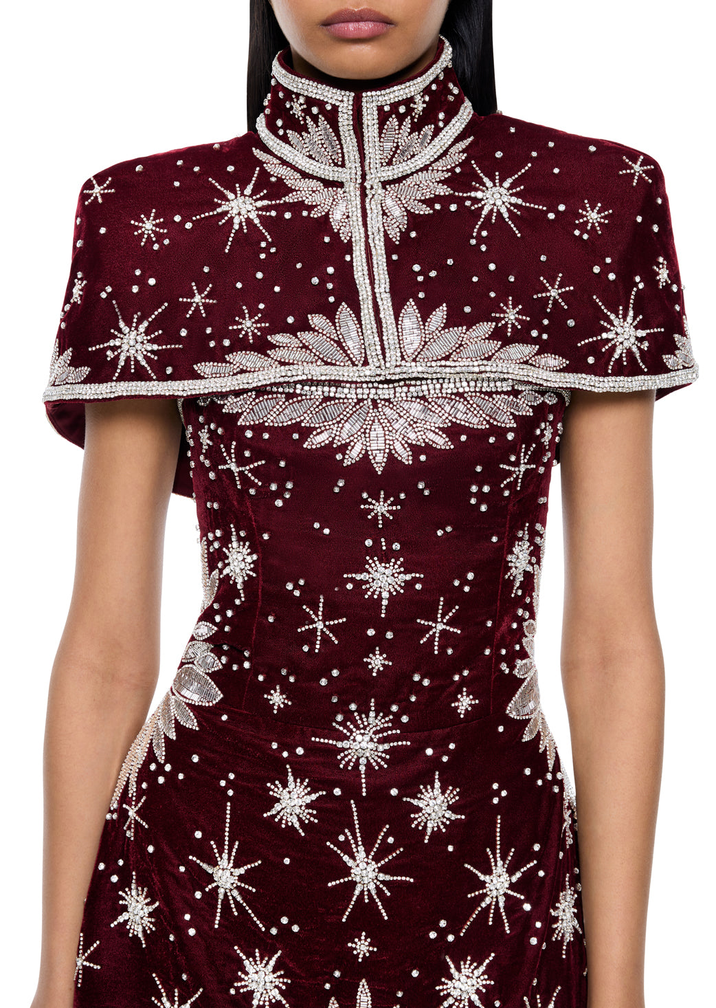 Annie’s Noel Cape has been crafted in a hand dyed velvet fabric for our Christmas Capsule. With intricate hand-beading throughout that shimmers with constellations of glass beads lined in silver foil and radiant rhinestones set in silver clasps.