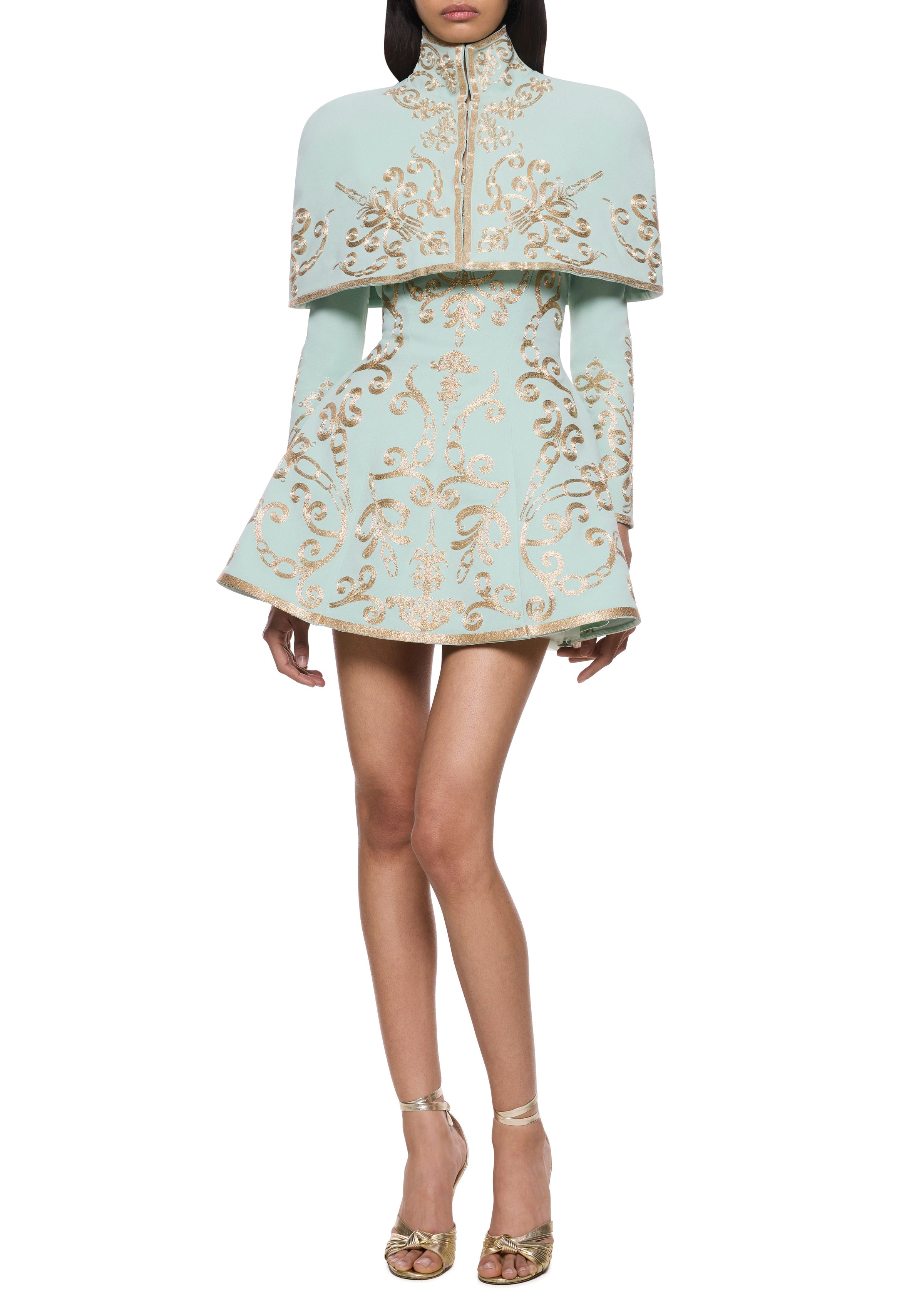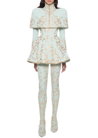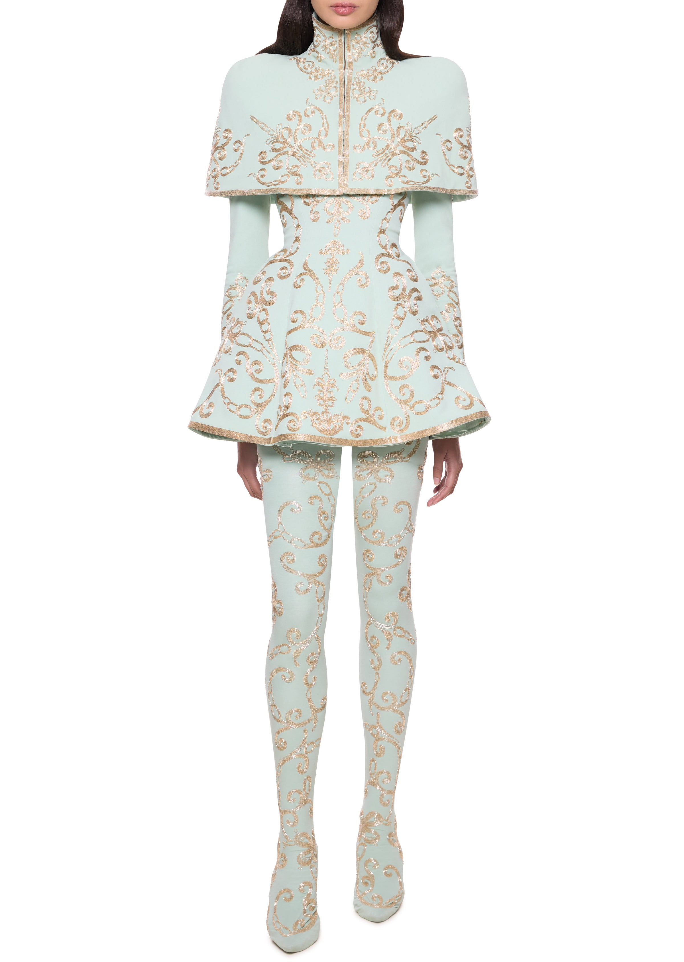 Designed on a soft powder blue base with a blend, its capelet and high collar echo the structured outerwear from these times. The ornate embroidery, reminiscent of Baroque decorative arts, is brought to life through golden thread work.