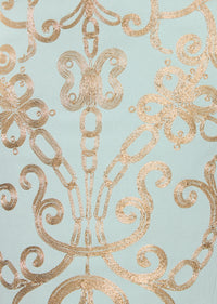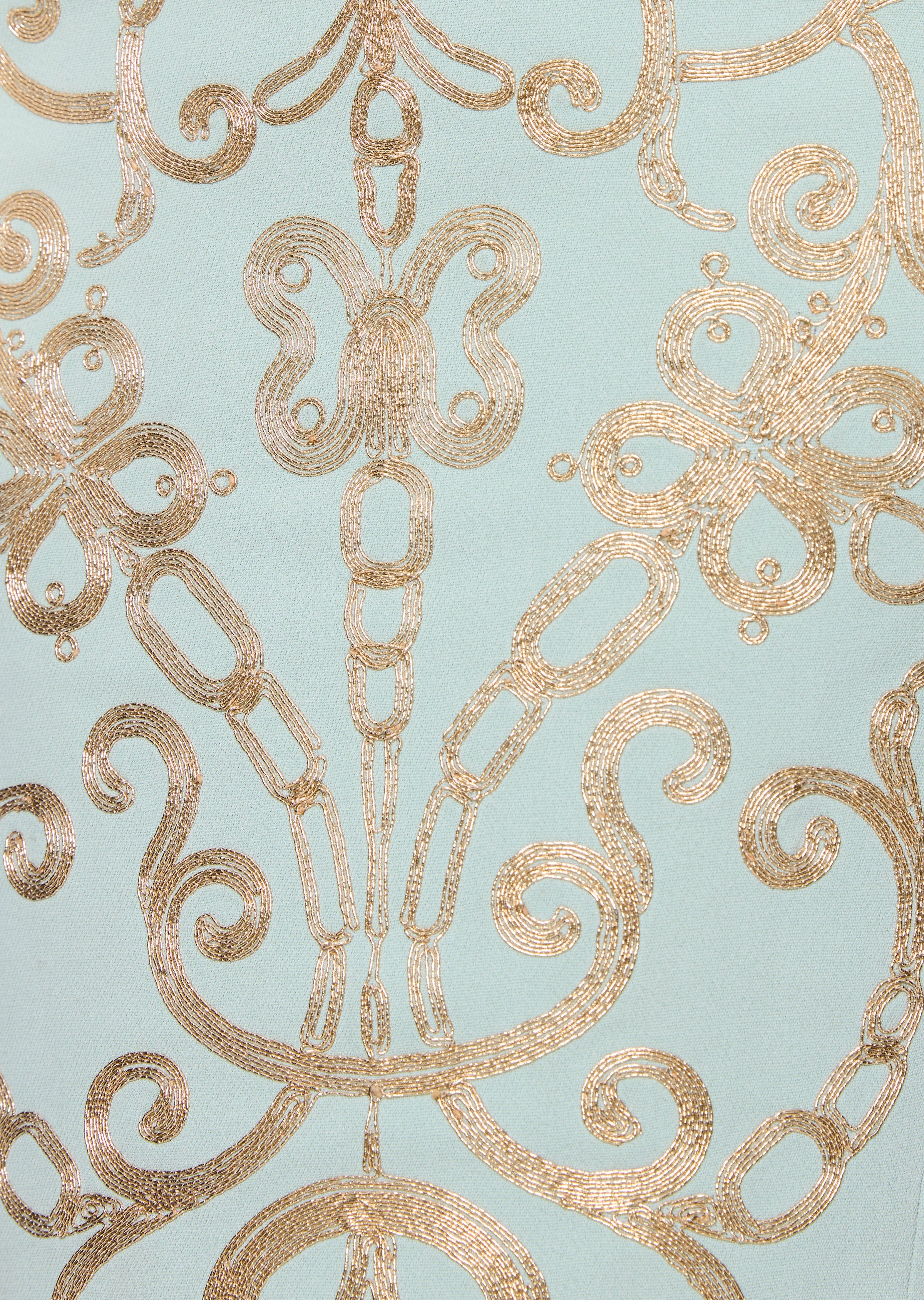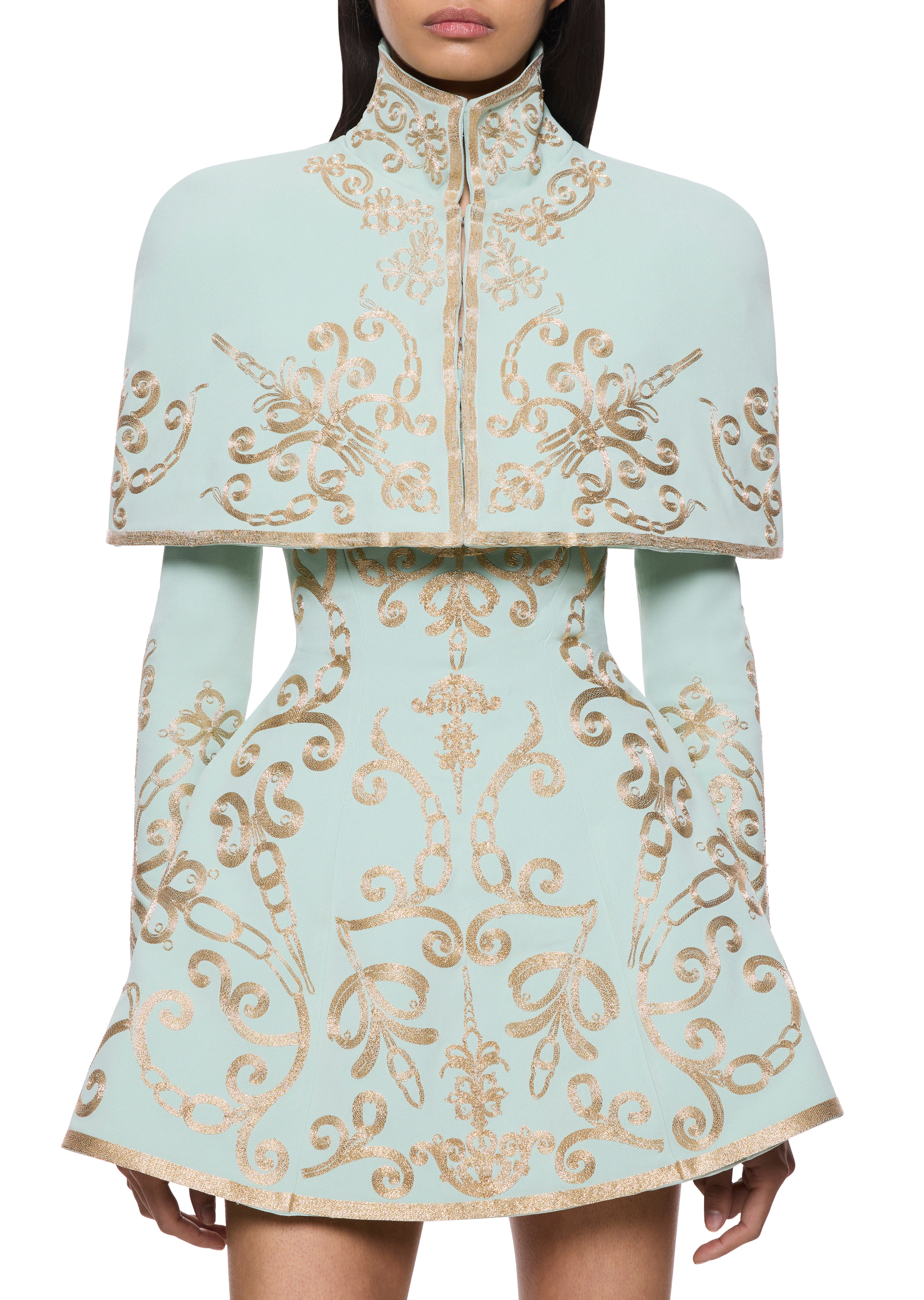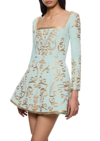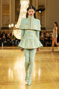 Designed on a soft powder blue base with a blend, the square neckline and delicate shoulder detailing frame the décolletage beautifully, while the sculptural sleeves enhance the timeless appeal. Designed with a flattering A-line skirt, creating a playful contrast from the support of the structured corset.The ornate embroidery, reminiscent of Baroque decorative arts, is brought to life through golden thread work.