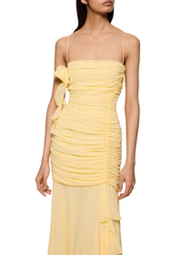 The Rosado Maxi Dress is crafted from a lightweight chiffon designed in a gorgeous sherbet yellow. The Rosado is selected for its playful and feminine silhouette, with a gathered bodice and full ruffled skirt.