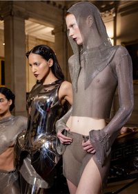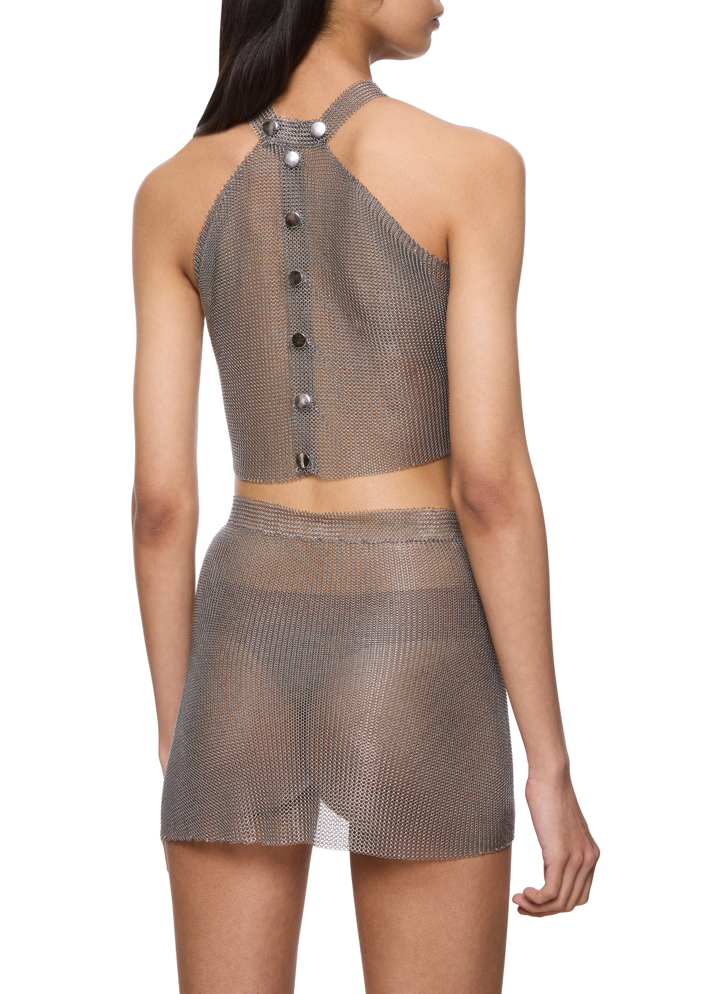 The Sforza collection is an audacious interpretation of medieval armour, reimagined here as a striking Halter Neck Top.