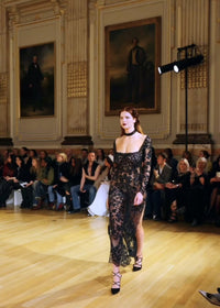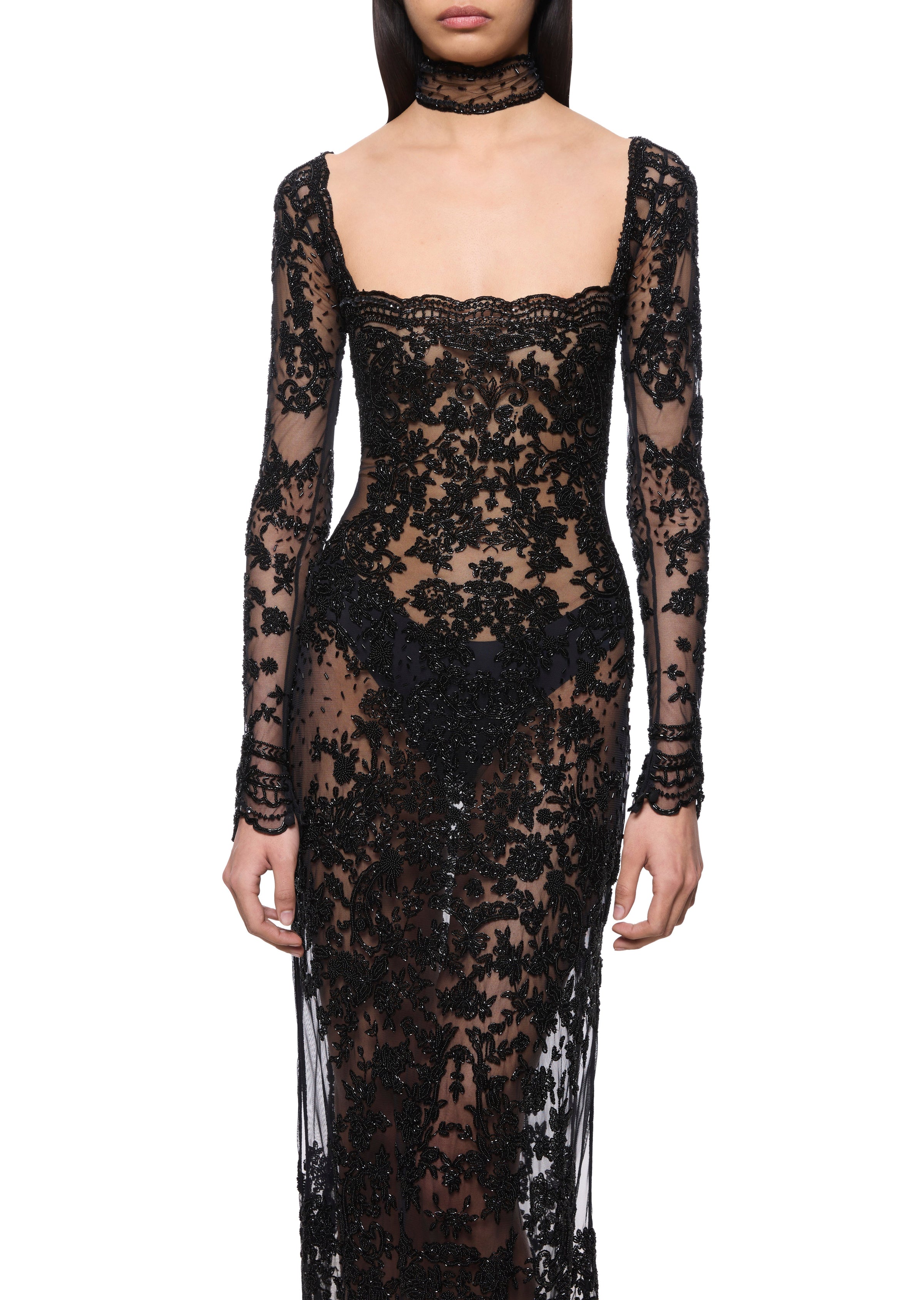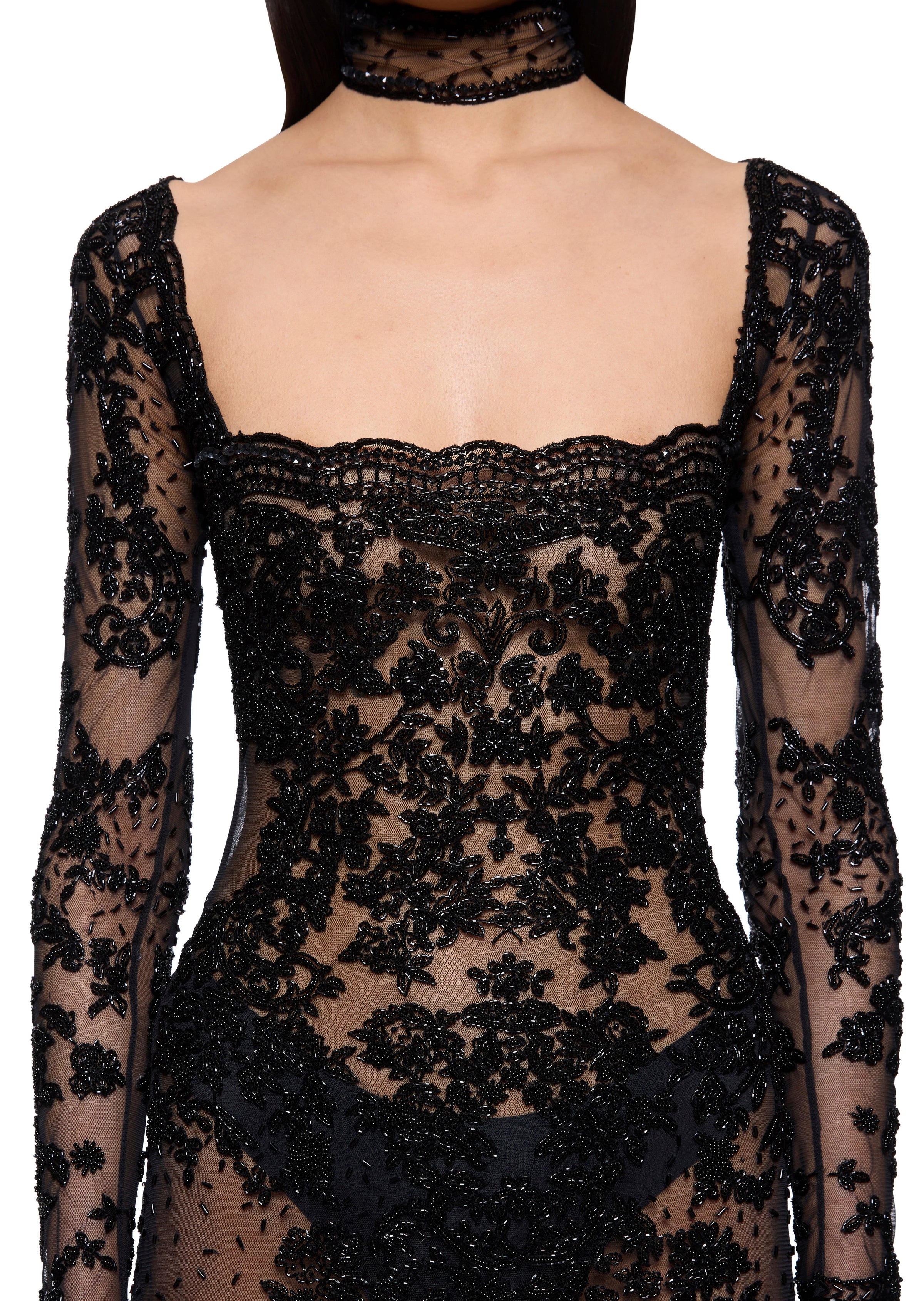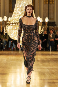 The sheer mesh base creates a contemporary canvas for time-honoured embroidery techniques.