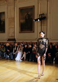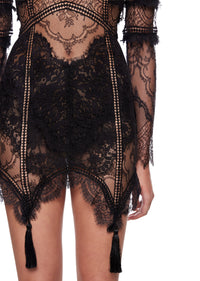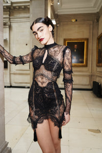 Drawing from the dramatic architectural elements of Renaissance cathedral spires, the Theodora Mini Dress combines intricate black lace with geometric panels and delicate tasseled details. The high Victorian collar and keyhole neckline create a striking silhouette that mirrors Gothic archways.