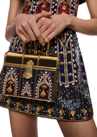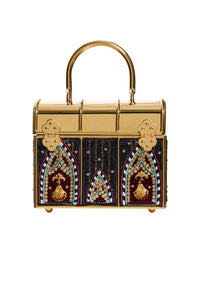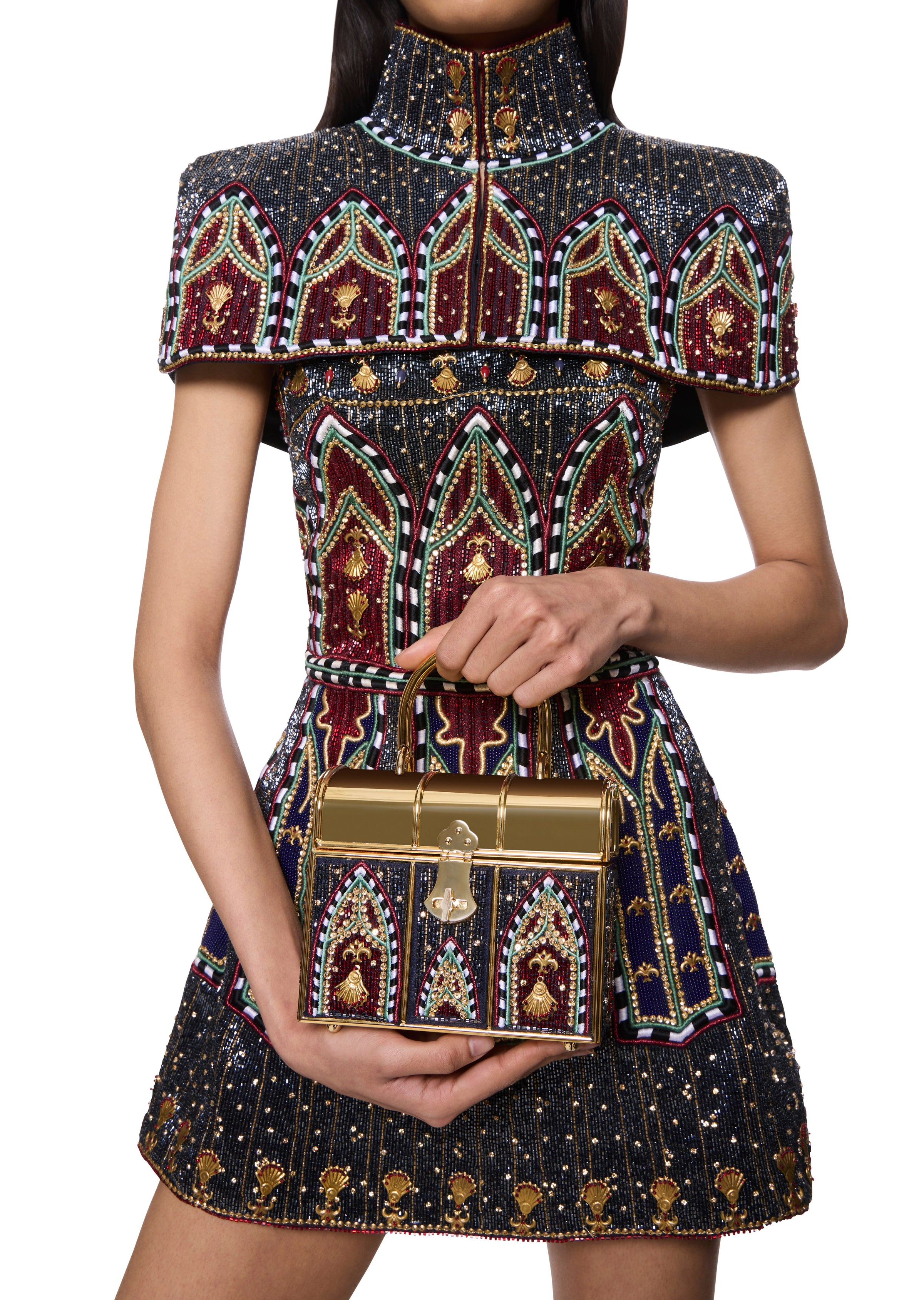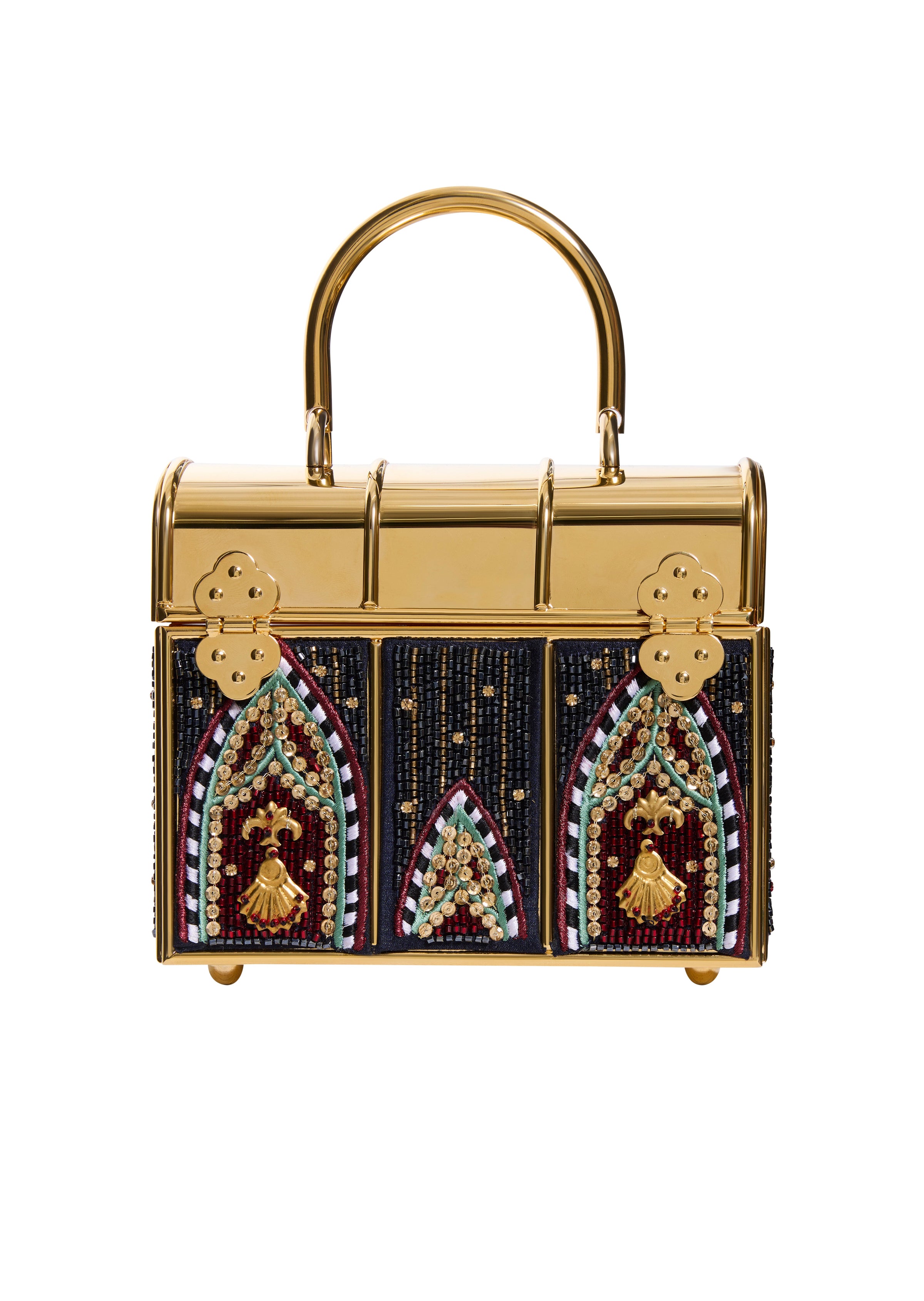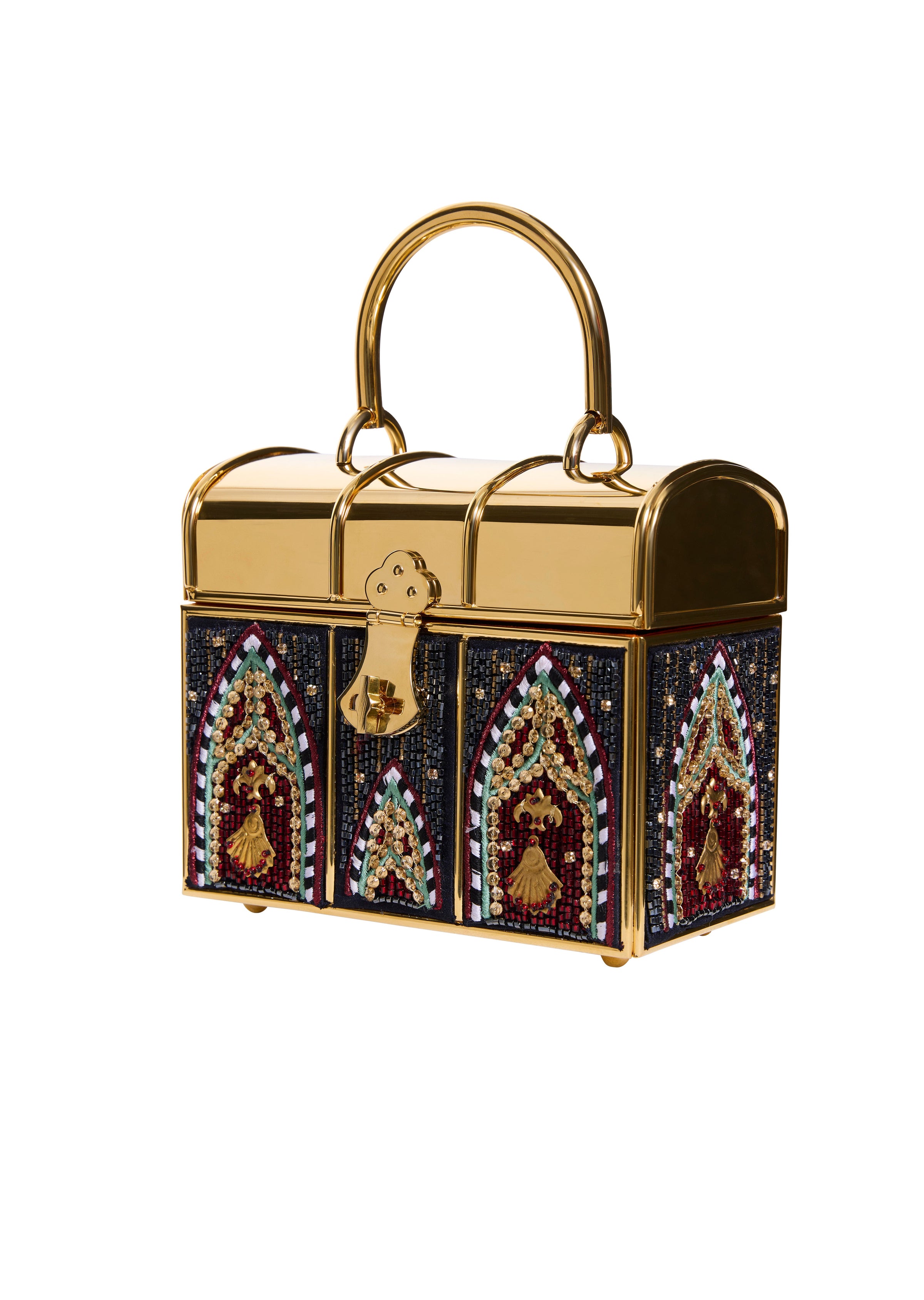 Annie’s debut bag, The Treasure Chest, is inspired by the opulence of 15th-century Italy and the Renaissance period. The design evokes the look of a traditional gilded reliquary, once used to store sacred relics and jewels, with a chest-like shape that opens to reveal Annie’s signature orange in a vegan lining, evoking the hidden treasures of Annie’s Ibiza.