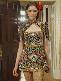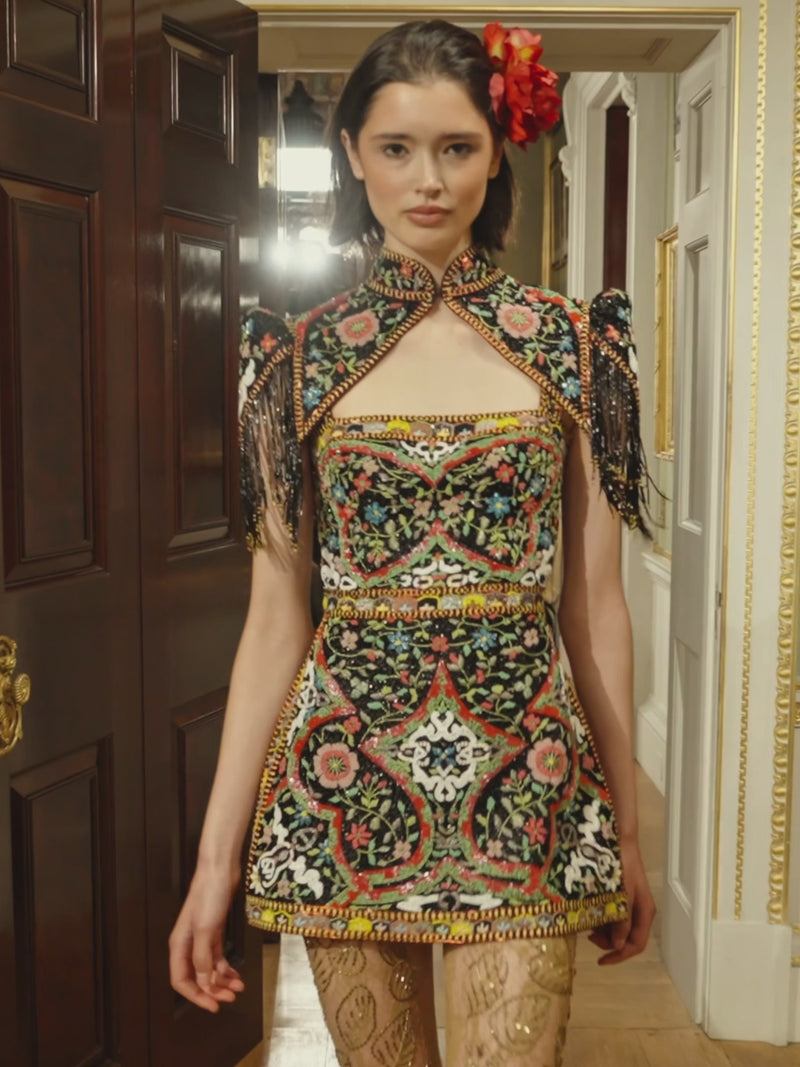 In over 40 individual thread colours, the embroidery achieves the same breathtaking kaleidoscope effect found in authentic Prussian and Slavic folk tradition, where every flower, every vine, and every leaf is given its own distinct hue. The structured, mirrored placement of the floral motifs is drawn directly from the sacred "Life Tree" and "Star" patterns of Eastern European thread work, designs that were historically believed to carry protective powers for the person who wore them.