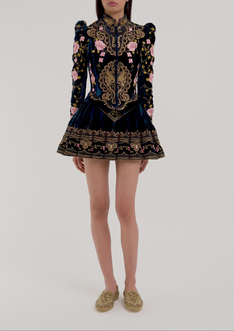 Set upon a deep turquoise plush velvet, the fabric serves as a rich canvas for its ornate detailing, where intertwining roses are brought together with a glass hand-beaded harlequin motif.