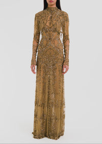 Inspired by Edwardian lace fabric sourced from Annie’s personal archive, the Daphne Gown features exquisite hand embroidery in an incandescent antique gold. Designed to replicate a second skin the sheer fabric showcases the transparency and artistry of the textile, allowing the fabric itself becomes the centrepiece.
