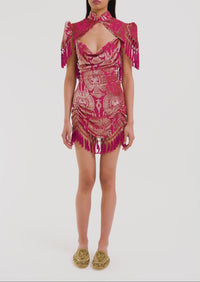 With a focus on sculptural draping and intricate ruching details to create a flattering silhouette, this piece is finished with hand-applied macramé tassels on the hemline, adding a bohemian edge to the vintage-inspired design.