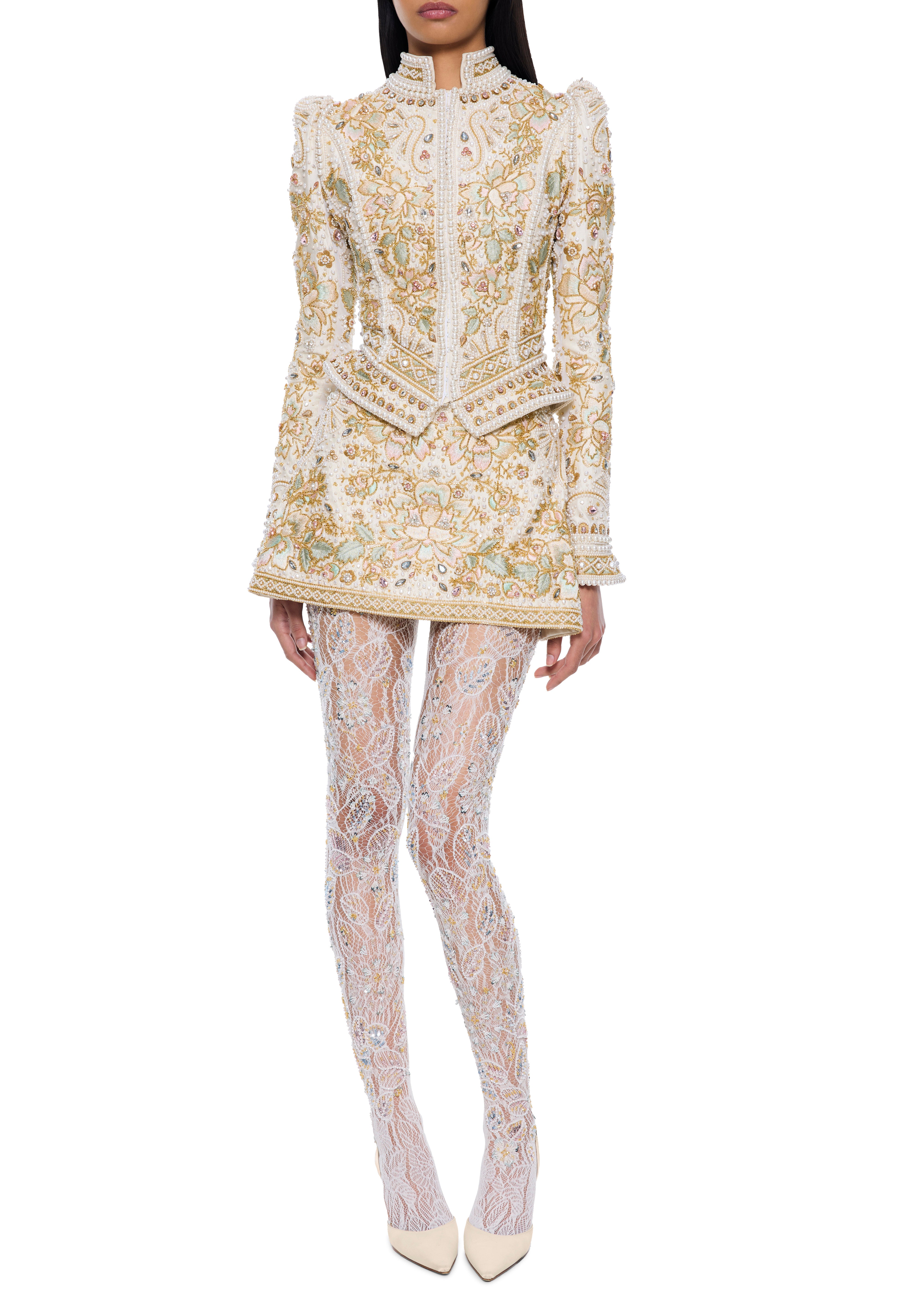 The Petal Tights are crafted from delicate stretch lace, intricately embroidered to create depth, texture and embellishment across the leg. The sheer base allows the embroidery to contour naturally with the body, balancing softness with precise detailing.