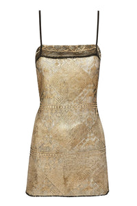 Drawing inspiration from the grandeur of Ancient Egypt and Art Deco design, this shimmering mini dress features intricate geometric patterns that catch the light with every movement. Delicately finished with a hand-stitched hem and elegant spaghetti straps, it’s the perfect piece for a night of dancing and decadence.