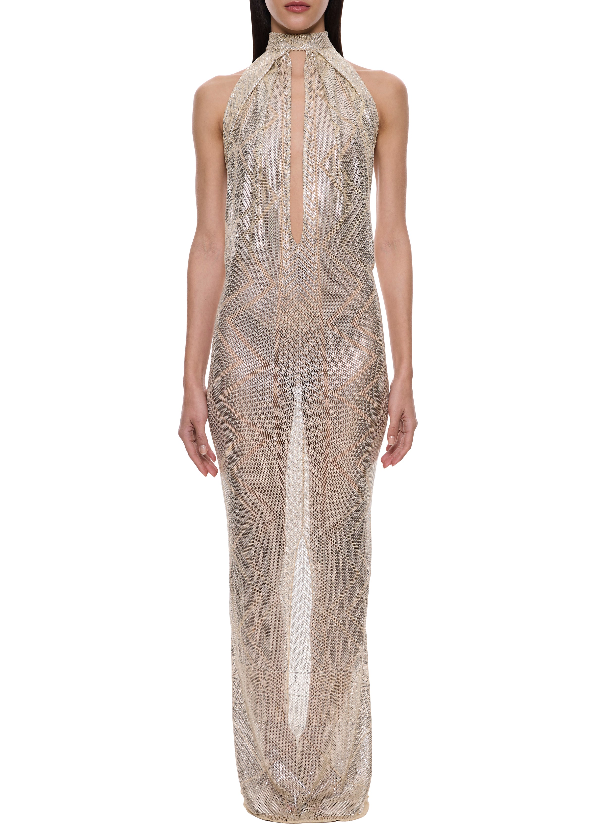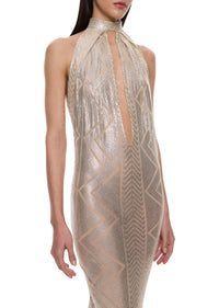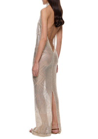 An original 1920's White Egyptian Gown with a halter neckline and completely open back, creating an incredibly chic and sexy silhouette.