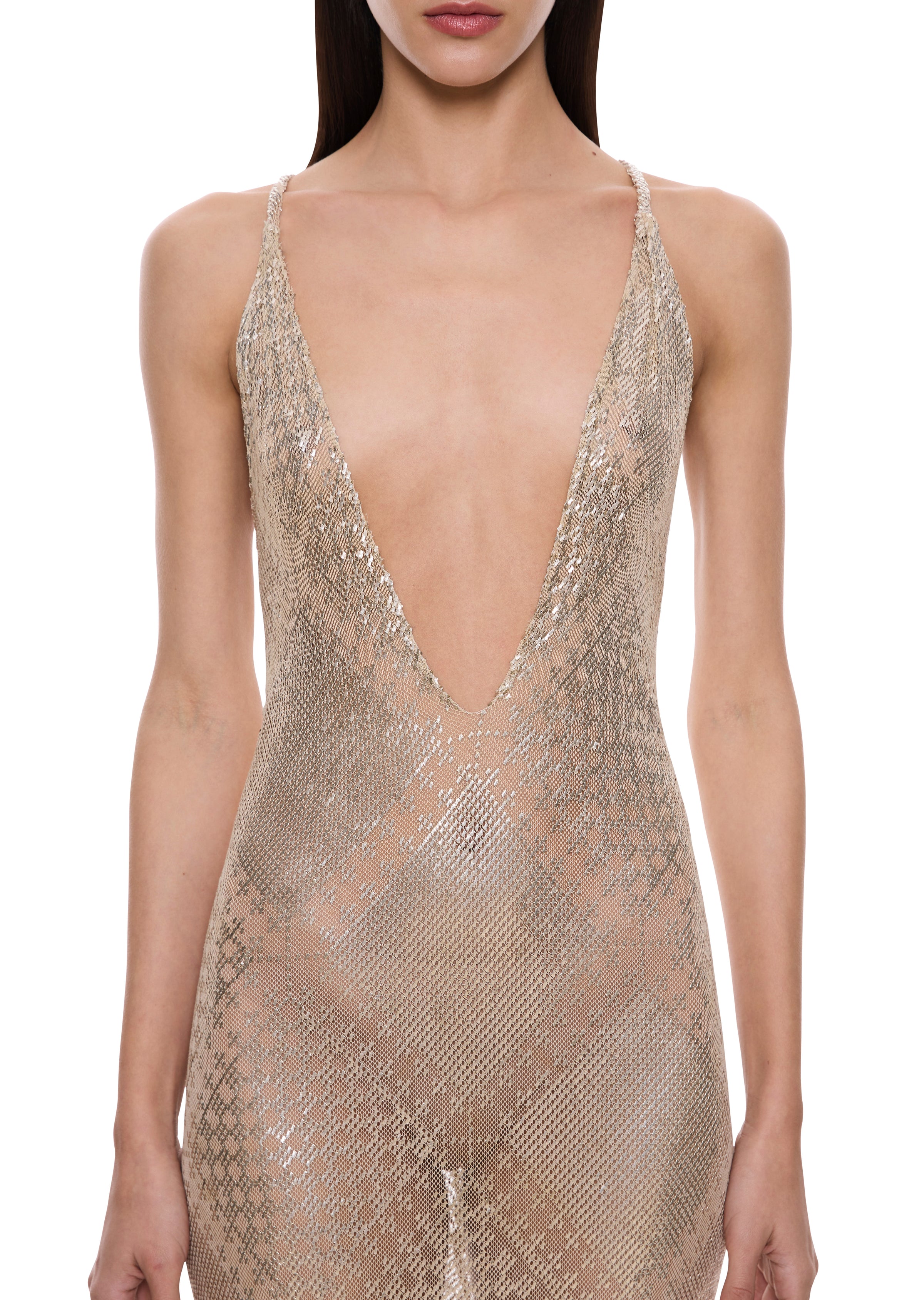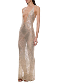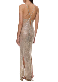 An original 1920s Egyptian White and Silver Gown with a deep and elegant neckline, balanced by delicate braided shoulder straps that cross over on the back. The gown skims the figure effortlessly creating a beautiful silhouette.