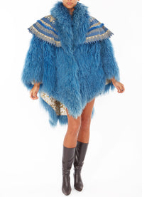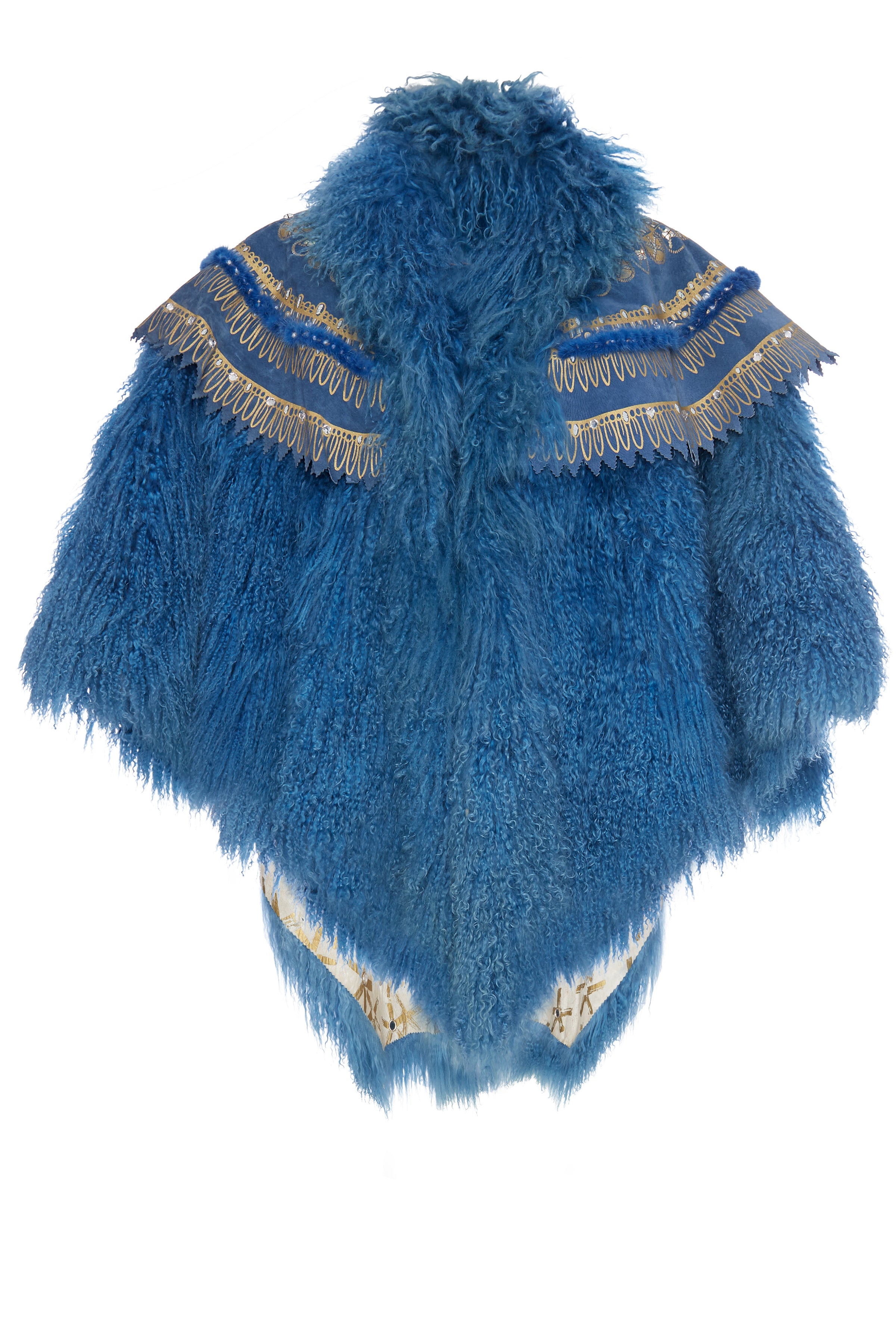 A rare Zandra Rhodes reversible suede and Mongolian-lamb- fur cape, 'Egyptian' collection, 1987, - unlabelled, with gold stencilling and spangled with rhinestones and mirror-studs, approx 92cm, 36in long