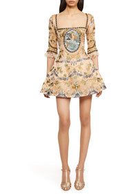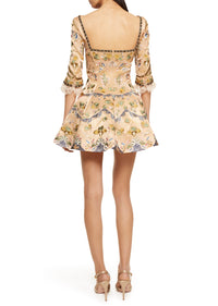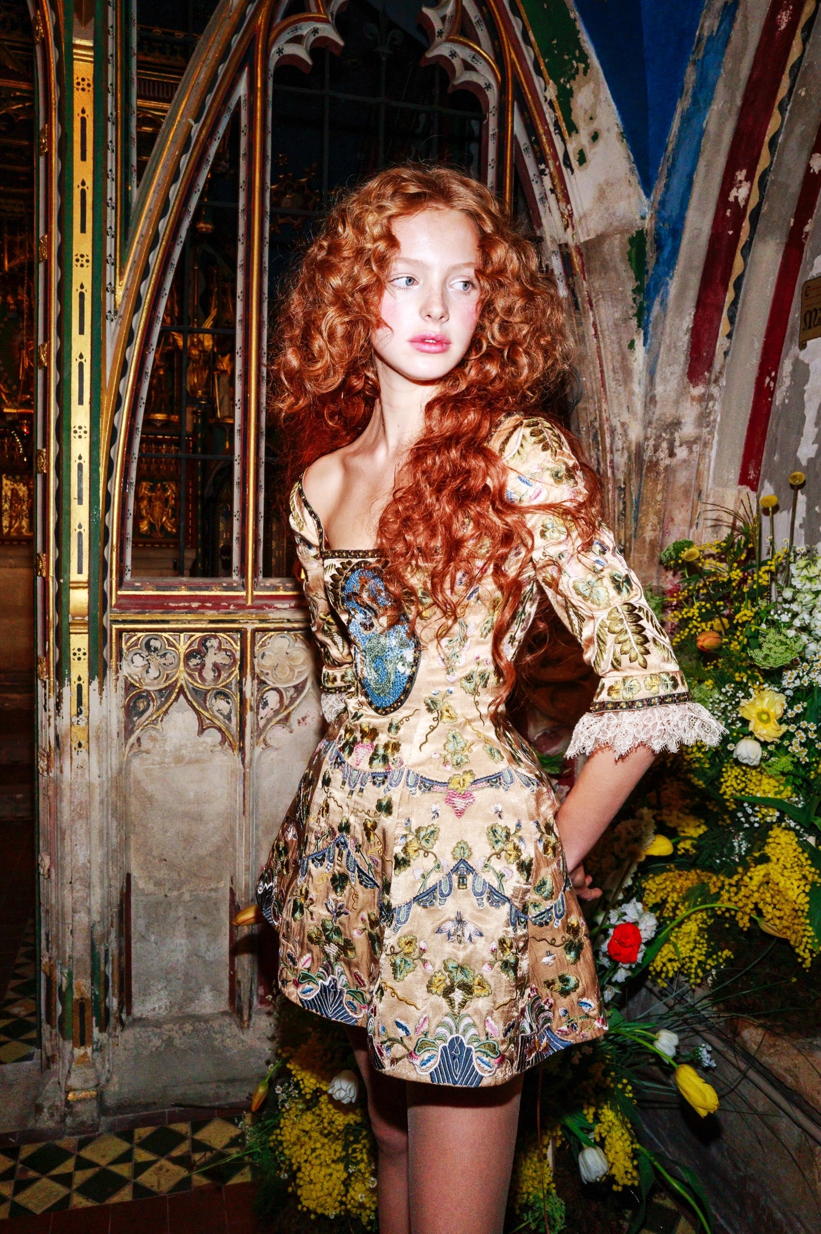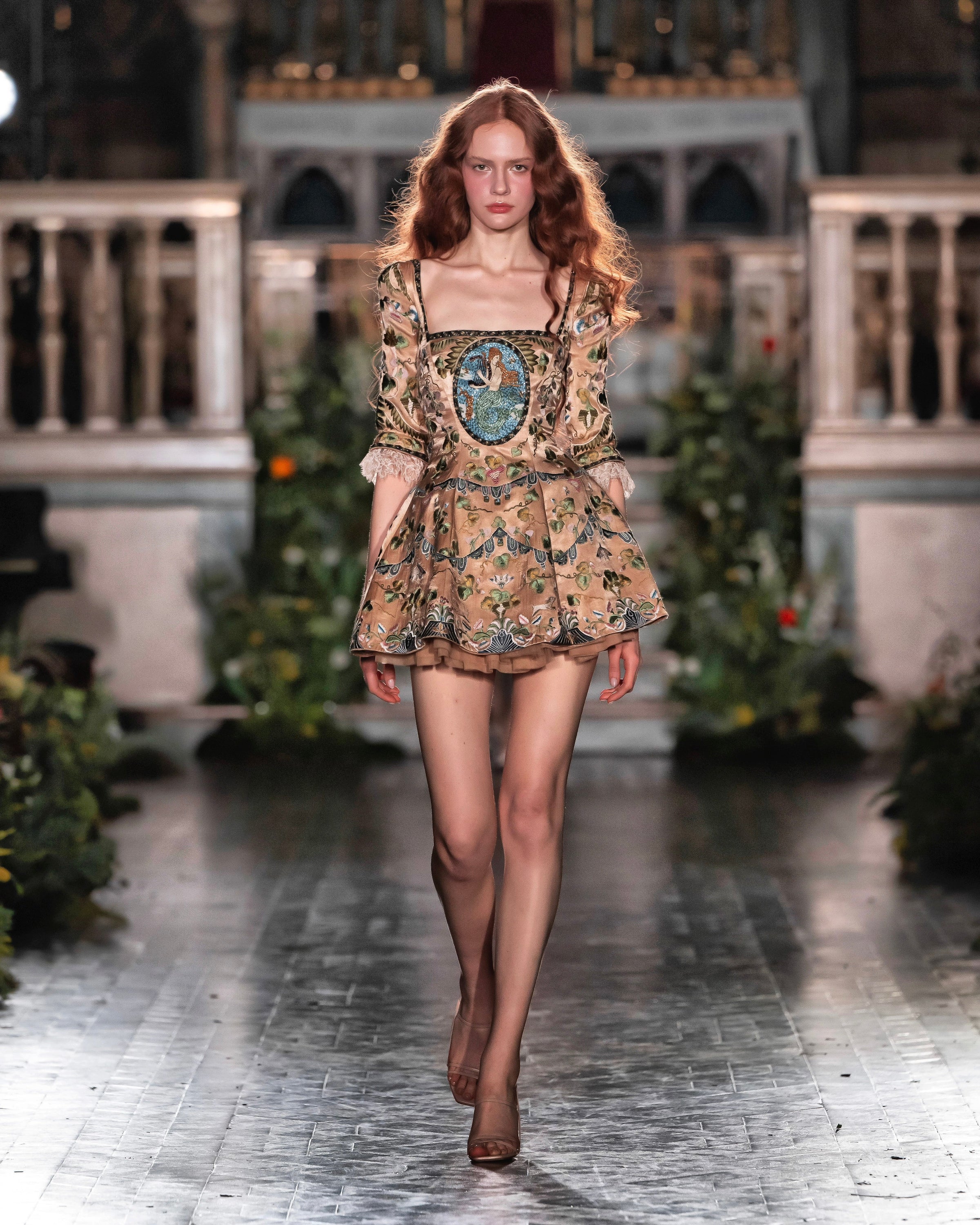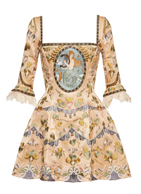 The timeless allure of the Aphrodite Dress intertwines 17th-century craftsmanship and techniques with vintage silhouettes. Utilising a captivating mix of stitch technique and shaded thread embroidery, the Aphrodite dress boasts hand embroidered placements, of mosaic, inspired by the mosaic that Annie has in her house. Creating a harmonious blend of organic motifs and historical detailing. The intricate embroidery creates a harmonious fusion of colour and texture. Boning provides structure and guaranteed support. The skirt falls to a playful a-line with lace detailing at the hem.