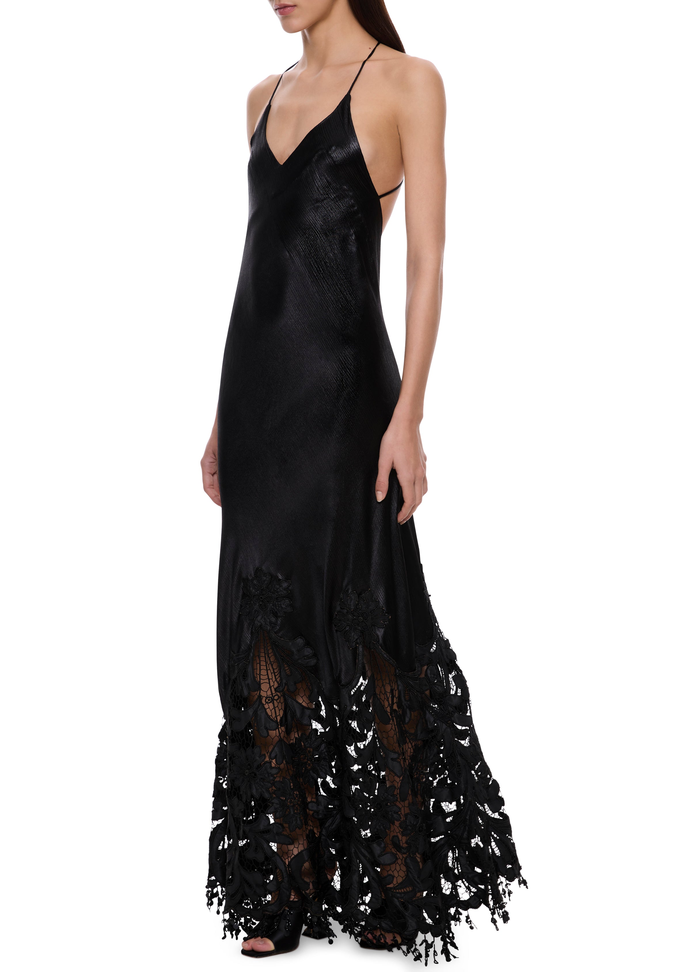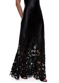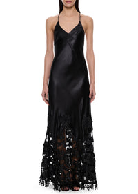A very rare 1920s black silk gown with a hand-beaded hemline. The gown is cut on the bias, allowing the silk to drape flawlessly over the body. A delicate halter neckline enhances the minimalist silhouette, while the lower hem flows into intricate floral lace embroidery.