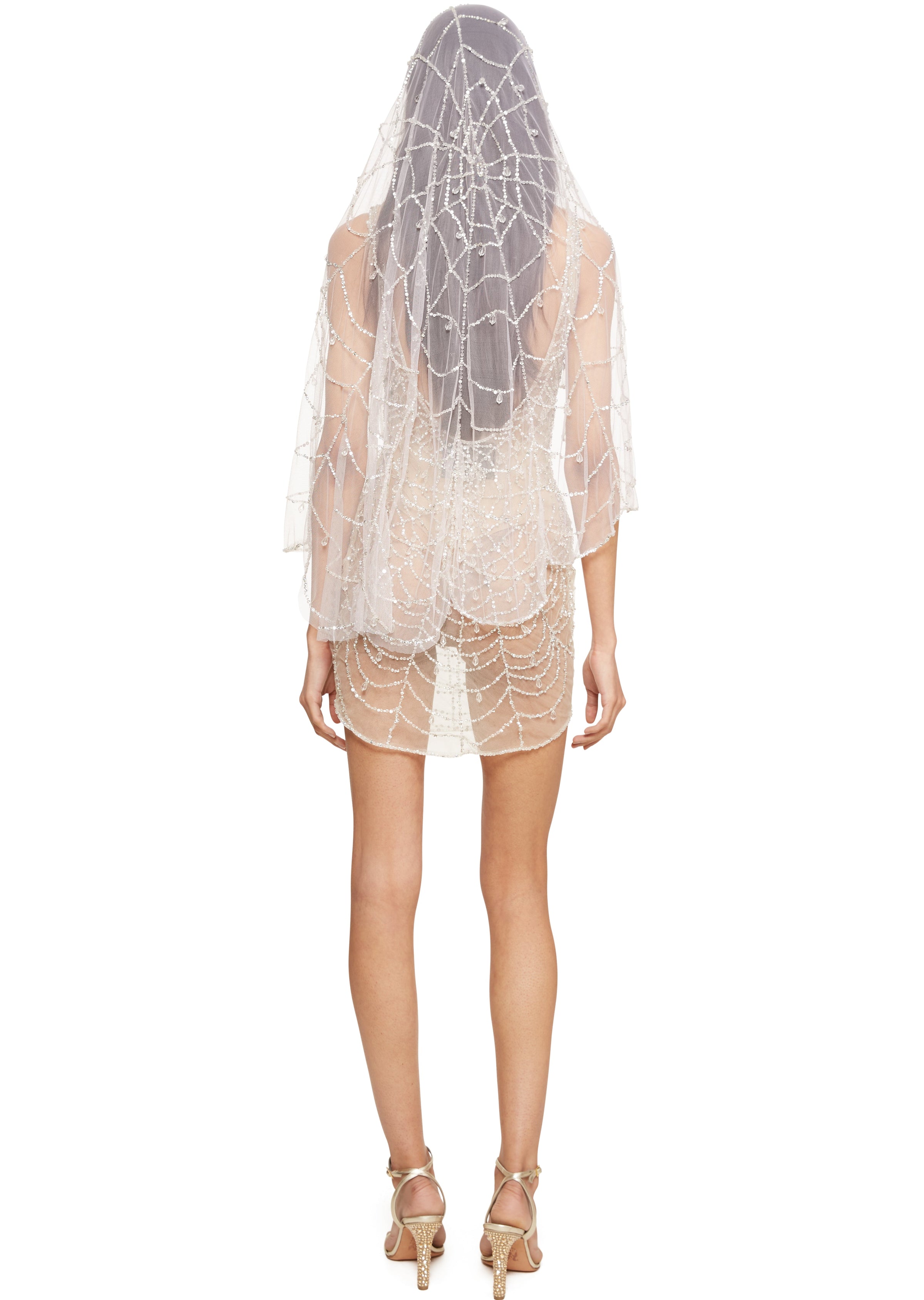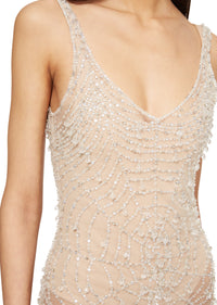 The silk mesh perfectly hugs the body to create the perfect silhouette. The spider-web pattern is embellished with two-cut beads.