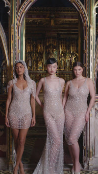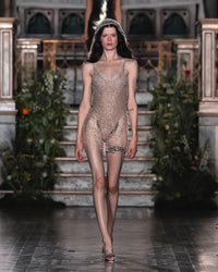 The Cobweb Mini Dress takes inspiration from natures great seamstress, the spider. The intricate webwork has been hand crafted with an array of glistening crystals that catch and reflect light, resembling dewdrops on a spider's web in the morning sun.
