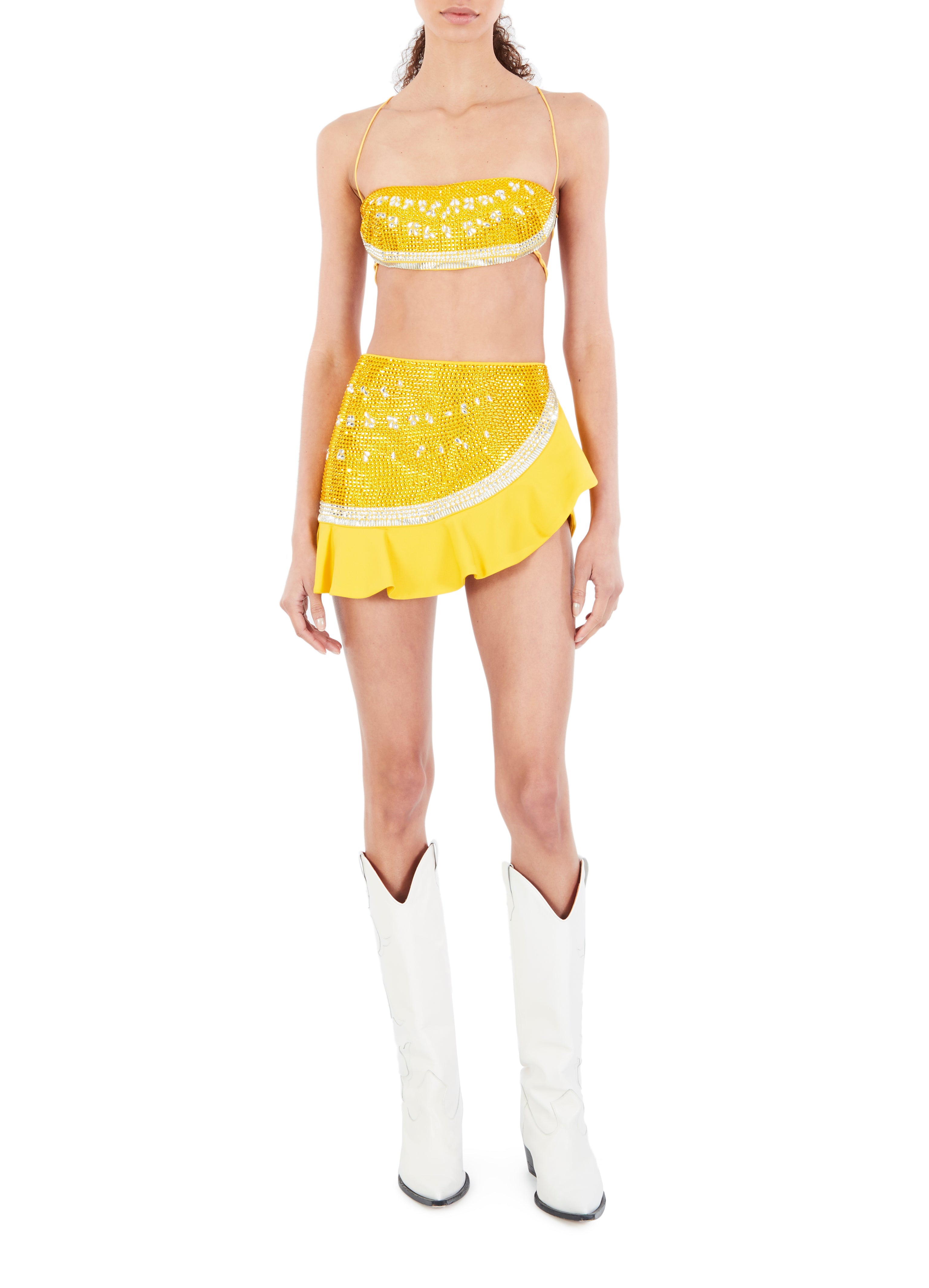 From Area's Spring Summer 2023 Collection, evening wool crystal watermelon bandeau features adjustable straps with "A" logo slider and crystal end caps.