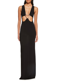 Long maxi dress crafted from fluid black jersey for a form-fitting look. A bikini-style top connects to the skirt segment thanks to silver triangle-shaped embellishments at the front and back of the dress. Each triangle is laced with ribbon ties that create their own geometric pattern against the skin. The geometric details are part of a wider SS24 collection message centred on the power of classic and contemporary sound technologies. In this case, the cut-outs are a nod to the triangle instrument which has one of the most distinctive sounds of the percussion family.