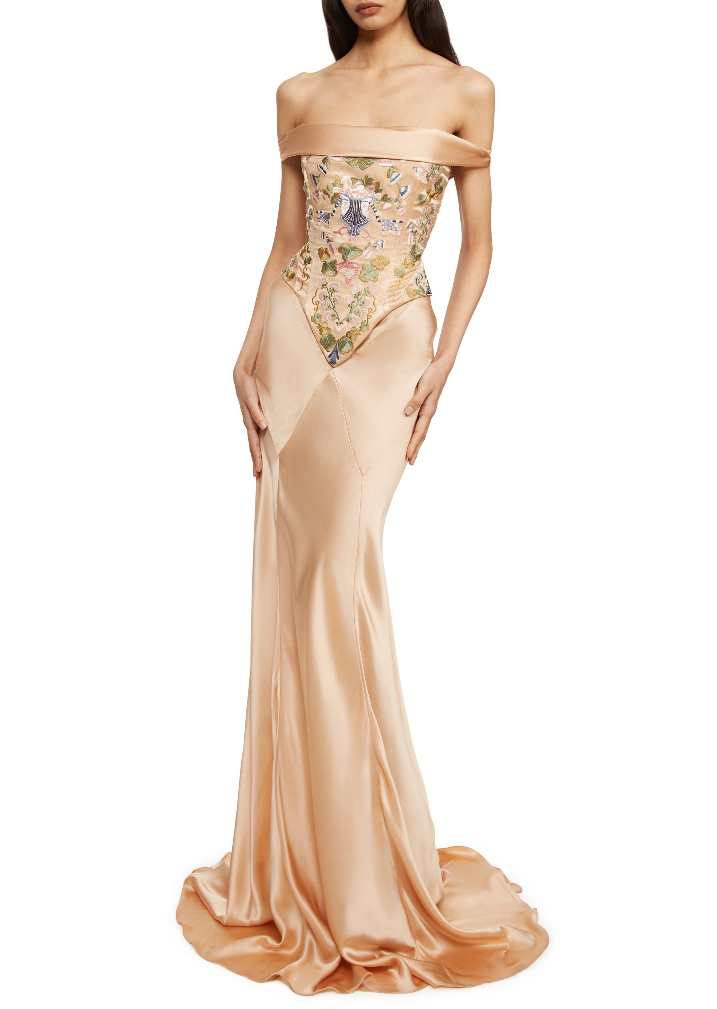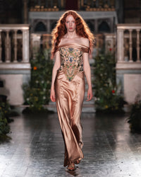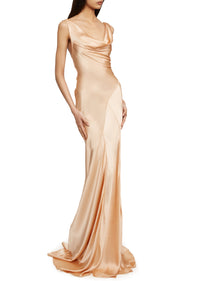 The Florence Dress has been crafted this season in from lightweight peach silk that moves fluidly with every step, creating an ethereal effect. The cowl neck detail adds a touch of understated glamour to the dress, draping delicately at the neckline to create soft, elegant folds. The soft peach hue of the dress exudes a sense of warmth and romance, making it the perfect choice for spring and summer events.