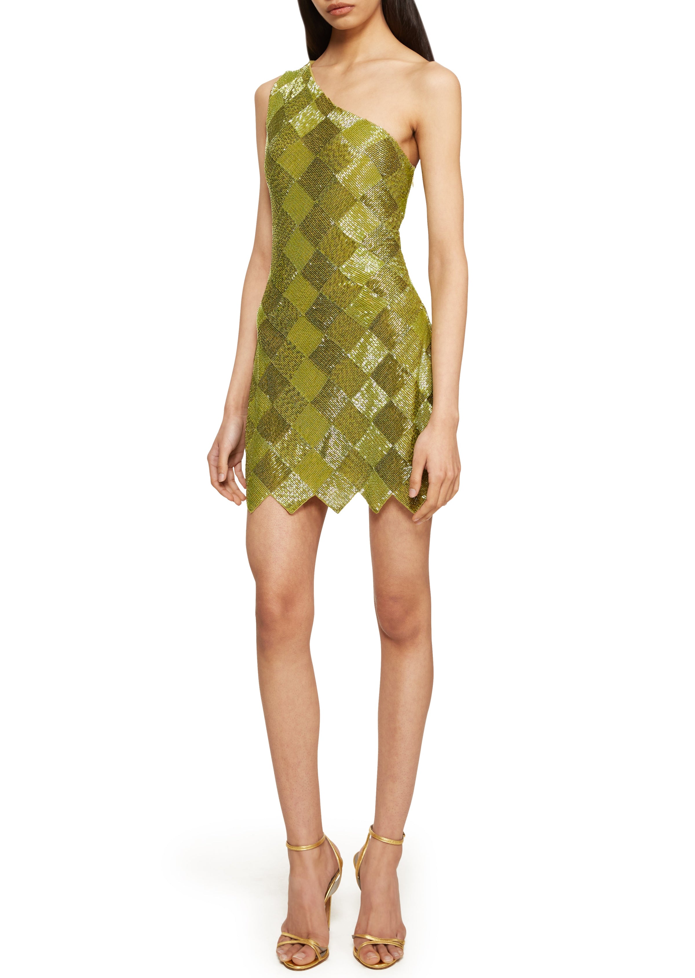 Hand embroidered shades of moss green bugle beads. Each bead has been meticulously hand-sewn onto the fabric into an intricate checkered pattern, creating a glistening effect. It features a one-shoulder design drawing attention to the décolletage and shoulders for a fitted yet sophisticated look. At the hem, a bold damier pattern creates a captivating contrast, to its asymmetrical neckline combining geometric shapes with the organic flow of the dress for a visually stunning effect.
