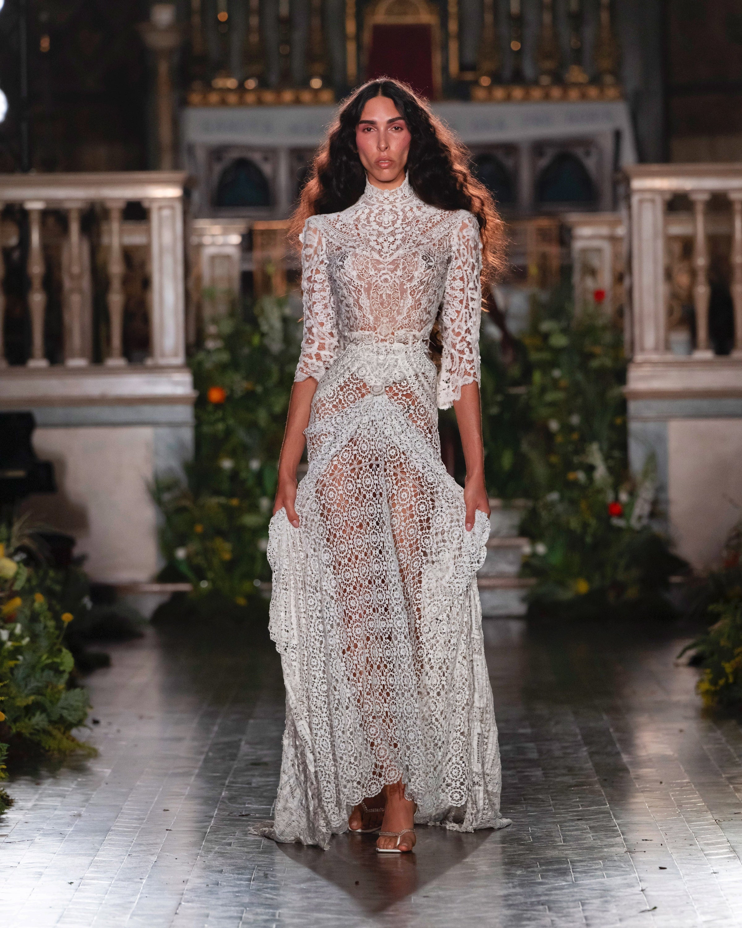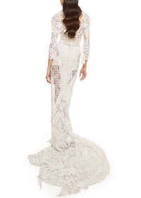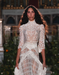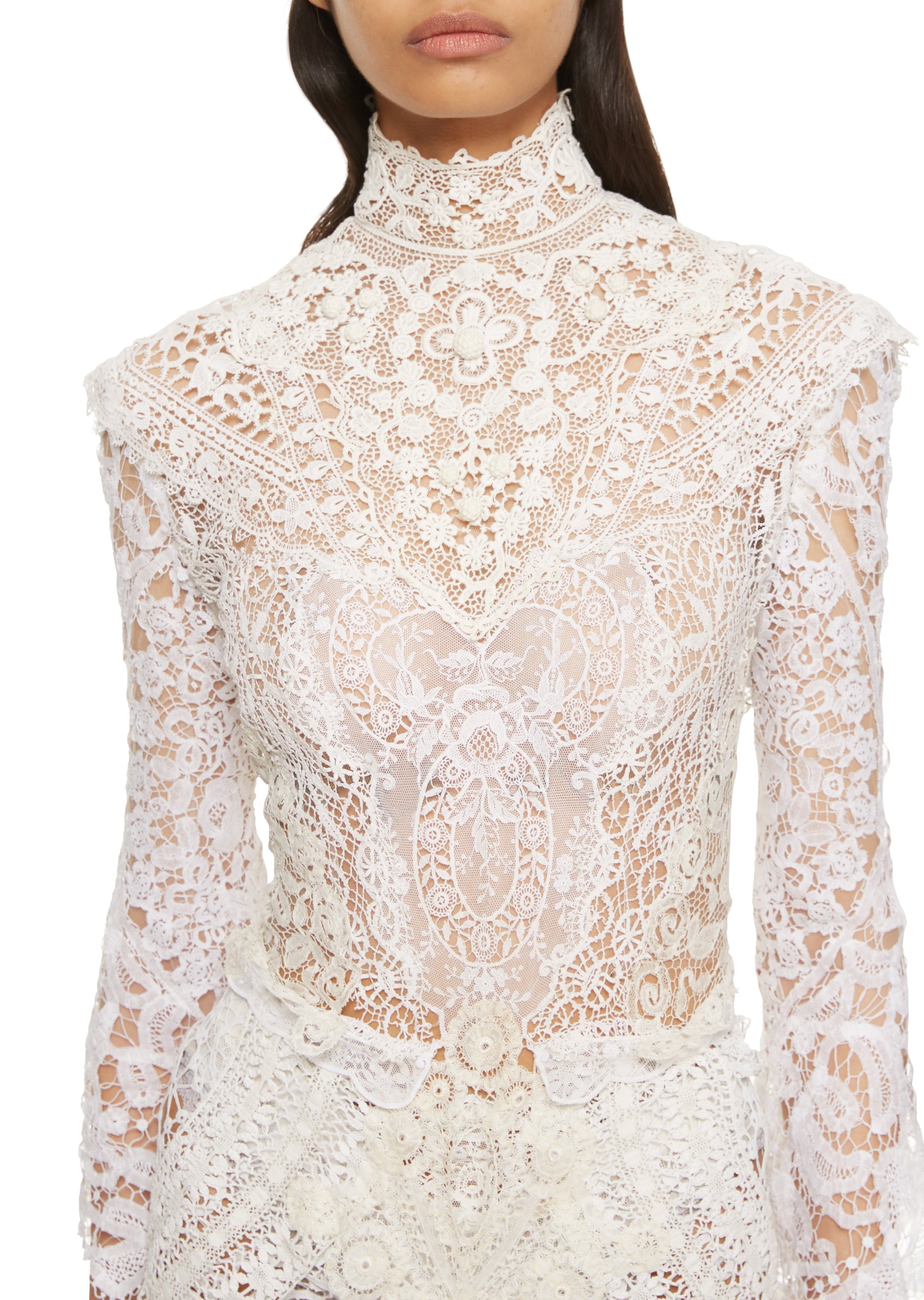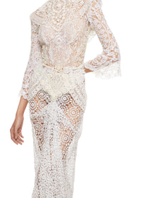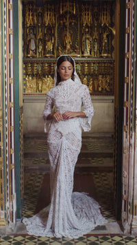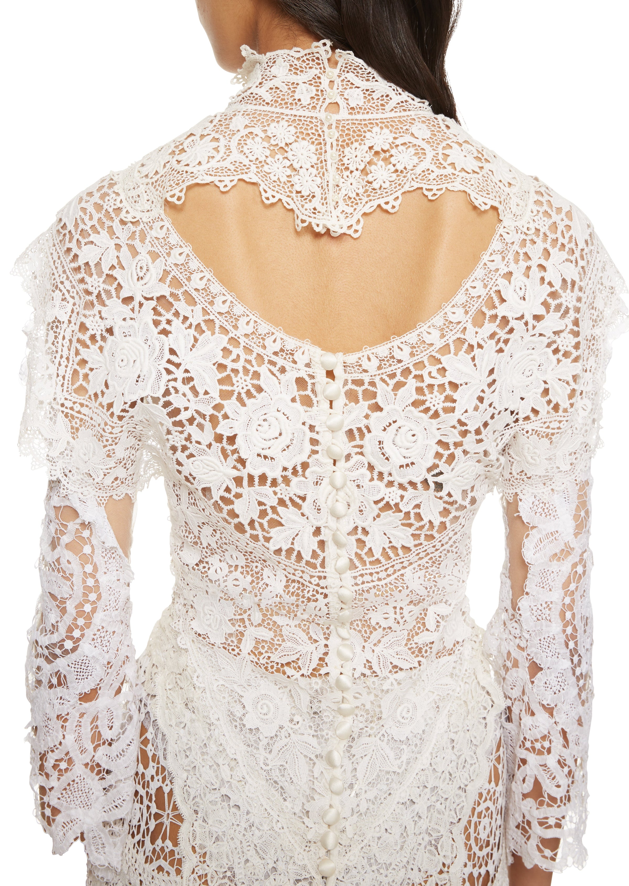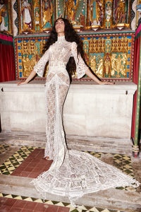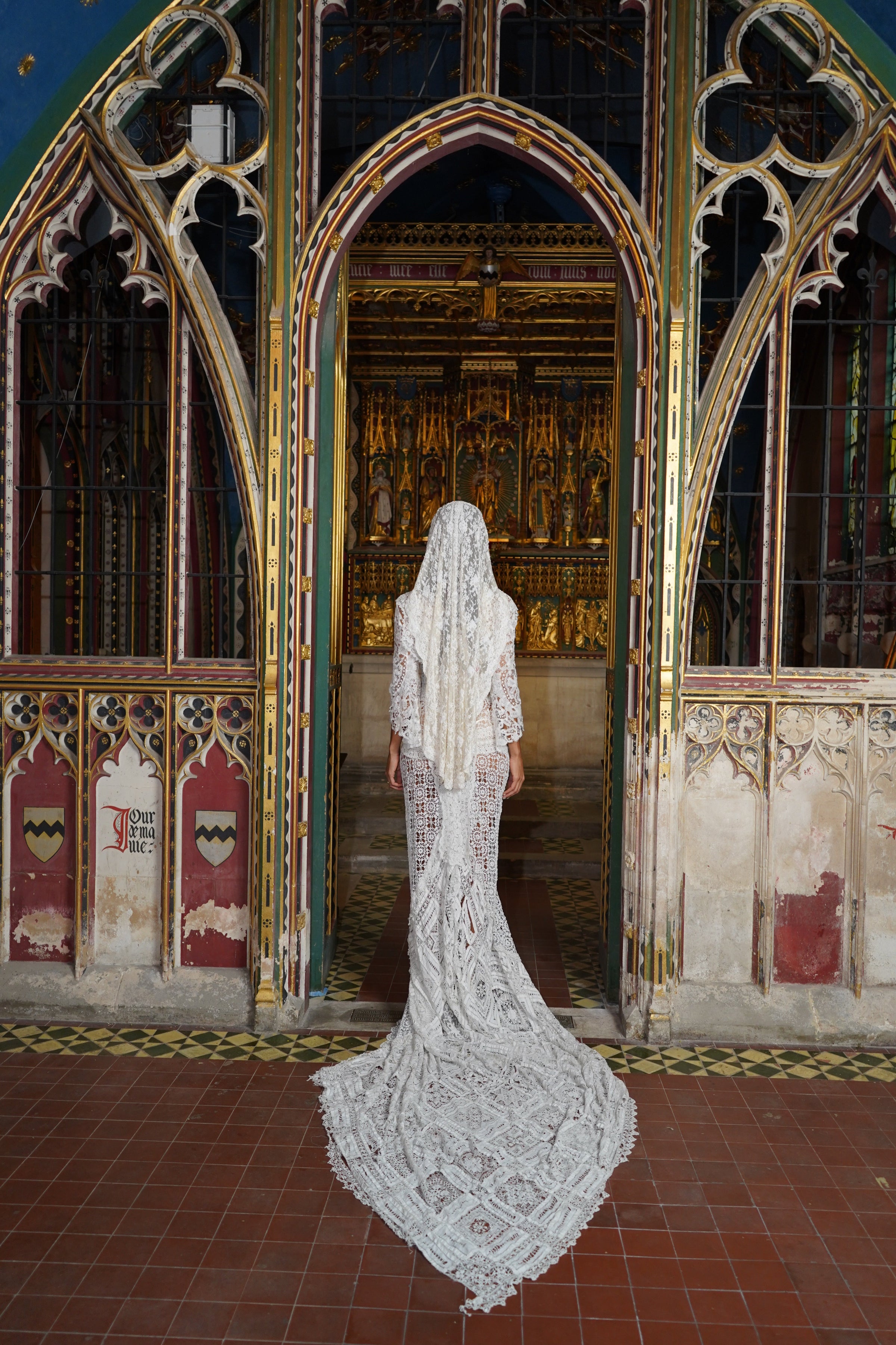 18th-century hand-stitched lace gown, Annie personally hand sourced each rare piece of lace to create this gown over the course of a year. Crafted with meticulous attention to detail. Lace in this gown is dating back from 1790 though to 1890. Sourced from Irish lace, English lace and french Chantilly laces.