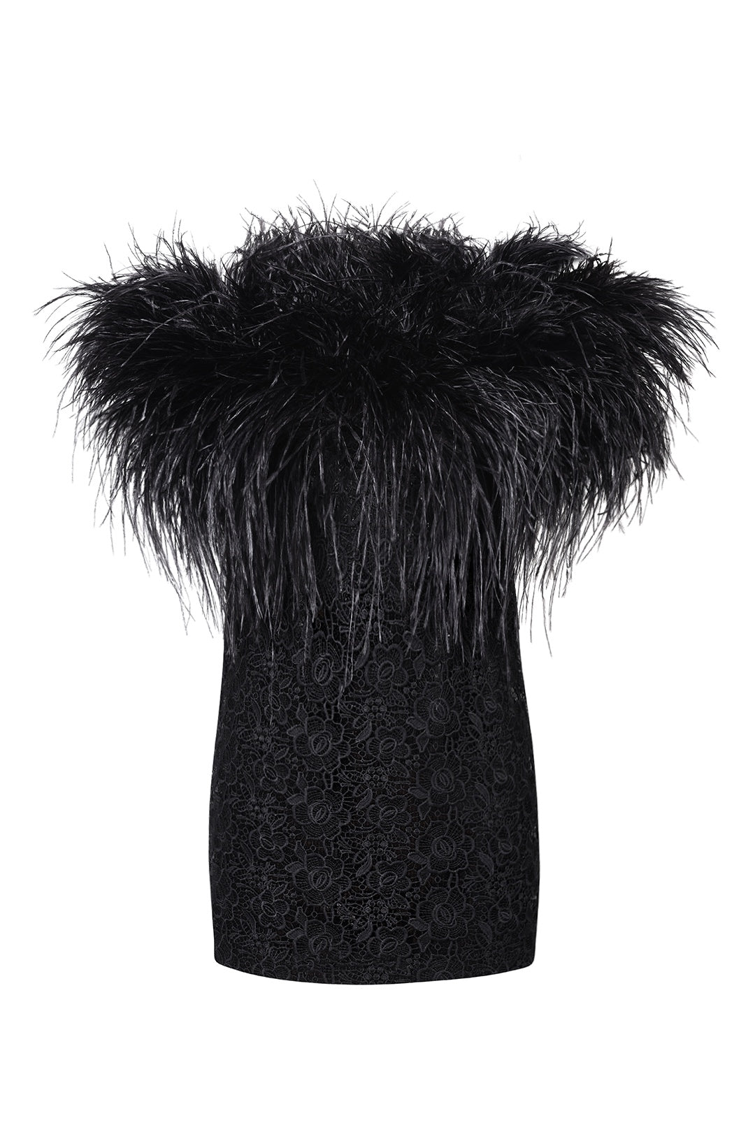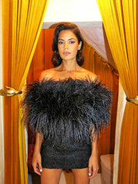 Straight from Richard Quinn's dark romantic SS23 runway is the Grace Feather and Lace Mini Dress. It's cut from lace in a column silhouette with ostrich feathers tracing the strapless neckline.