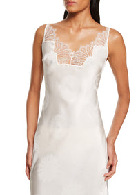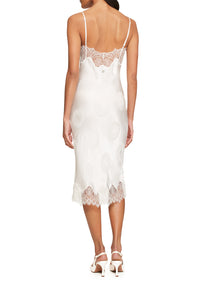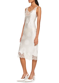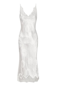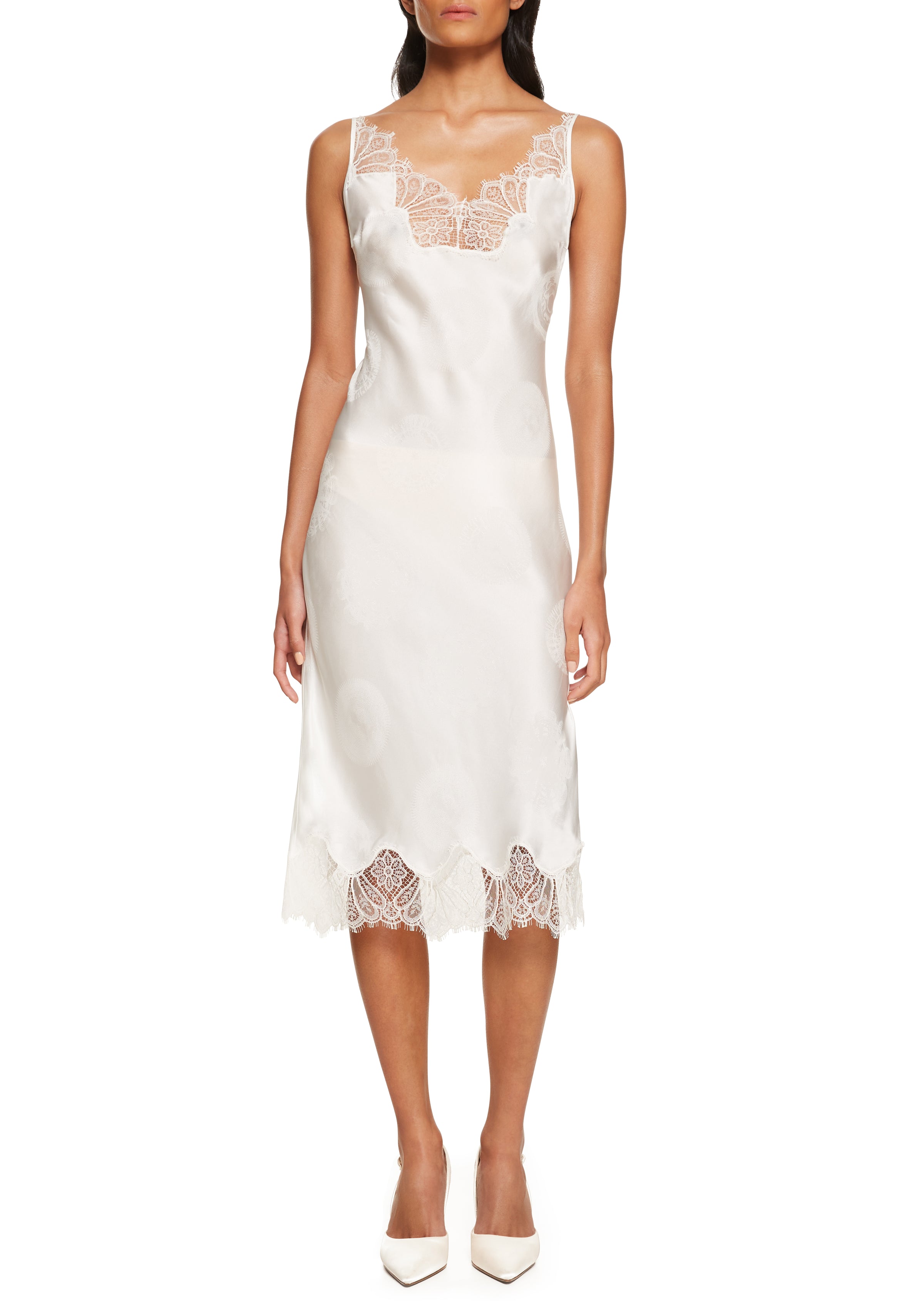 This lingerie-style white silk dress features a semi-sheer lace neckline which skims the chest with a delicate scalloped edge.
