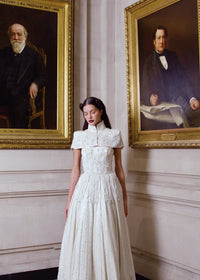 A statement of strength and elegance, the Joan of Arc Gown in Opal transforms sacred grandeur into wearable art. Inspired by the timeless beauty of medieval architecture, this intricately hand-embellished gown is a masterpiece of craftsmanship.