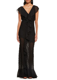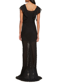 The Macaroon Maxi Dress in Black Chiffon is a feminine fluid style crafted from a lightweight pin tucked textured Chiffon and finished with ruffle detailing to the centre front. This flowing, fluid maxi is beautifully cut on the bias to create a bohemian, tumbling silhouette, comes complete with a detachable slip for a less sheer aesthetic and is finished with hook-and-eye fastening down the centre.