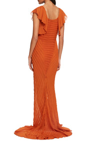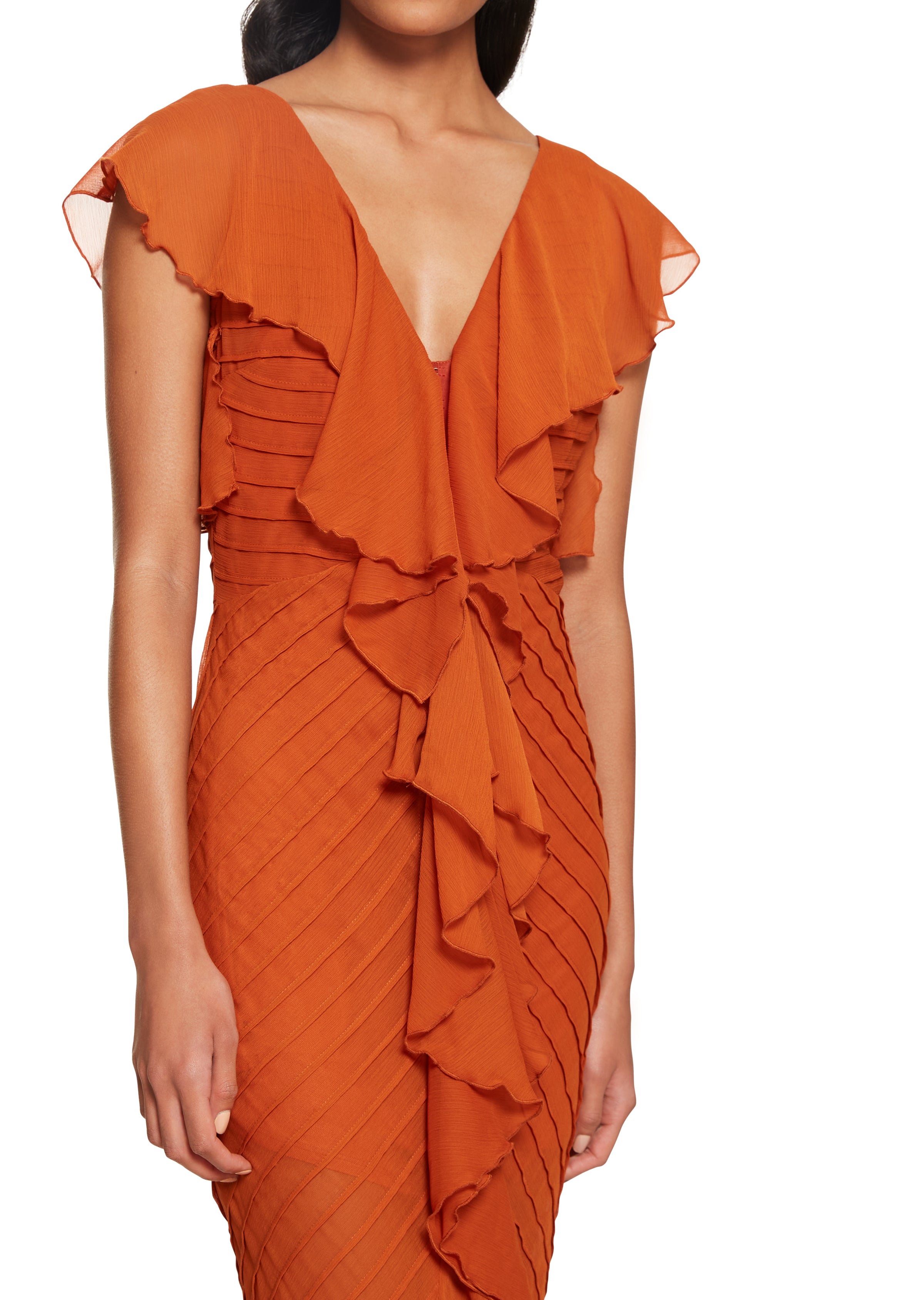 The Macaroon Maxi Dress in Terracotta, is a feminine fluid style crafted from a lightweight pin tucked textured Chiffon and finished with ruffle detailing to the centre front. This flowing, fluid maxi is beautifully cut on the bias to create a bohemian, tumbling silhouette, comes complete with a detachable slip for a less sheer aesthetic and is finished with hook-and-eye fastening down the centre.