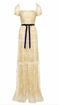 Use the detachable velvet bow belt to further accentuate your waist. This dress seamlessly blends shimmering metallic threads with delicate lace creating a captivating fusion of elegance and allure.