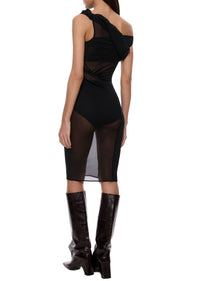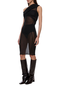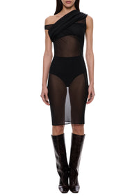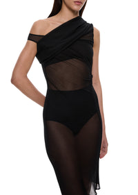 The Sahara Sheer Mini Dress is crafted in black tech organza and features a low shoulder strap with a twist of fabric that runs across the chest and drapes under the right arm. This semi-transparent fabric is sustainably made from GRS-certified recycled polyester.