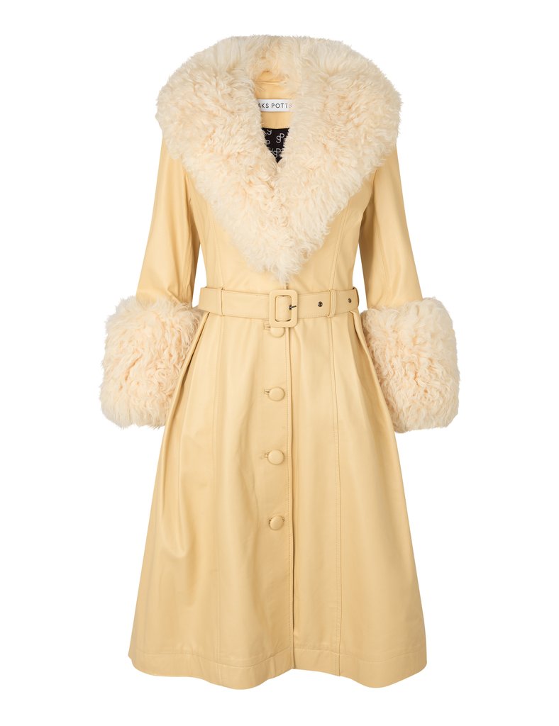 The Foxy Coat is a signature style by Saks Potts. The elegant silhouette is an expressive, yet, timeless piece. Features high-quality lamb leather and soft lamb shearling trimming waist belt and button fastening through the front. Lined with "SP" black and white logo print within.