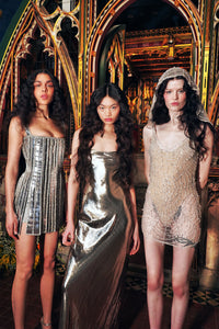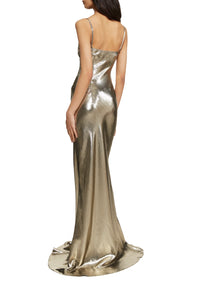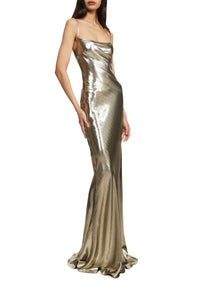Crafted from liquid silver metallic lamé fabric, this dress causes a mesmerising effect that allows you to glide across the room. Featuring a classic slip-style design, the dress boasts a figure-hugging fit that skims the body gracefully, providing a comfortable and flattering silhouette. The thin spaghetti straps delicately frame the shoulders adding femininity to the overall look.