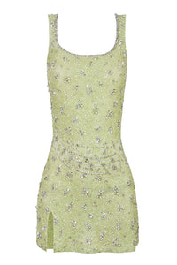 Enter the world of Clio Peppiatt with her new Autumn Winter collection - the Wren embellished mini dress in a matcha colour. Celebrating the craftsmanship of our artisan makers, the Wren Dress is hand beaded in a radiant Matcha Green with luscious clusters of translucent orbs and crystals. An ultra-flattering belt detail adds a touch of sparkle.