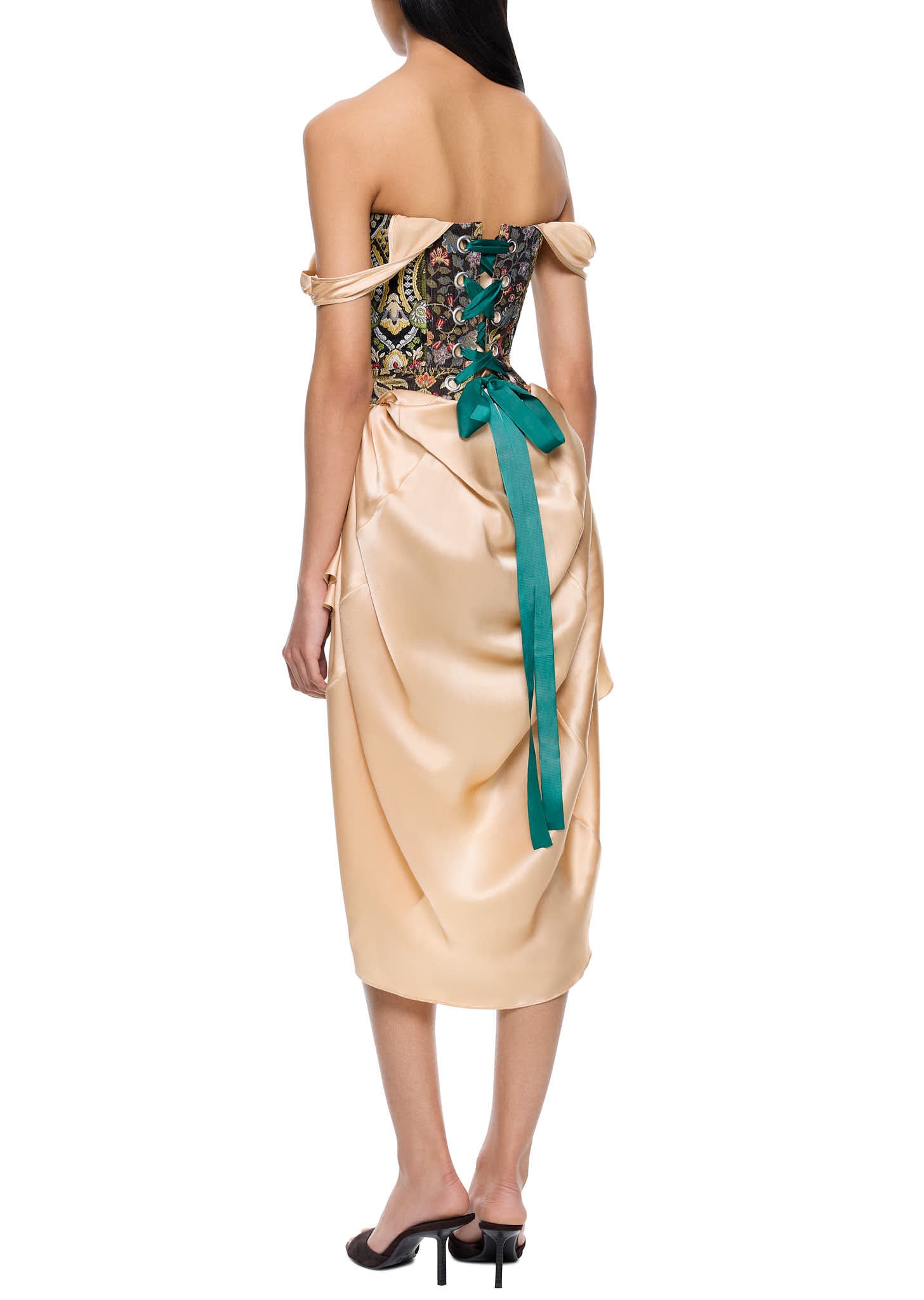 Made in Collaboration with Kristin Mallison, the Meadow Corset is cut from vintage french tapestries and carefully pieced together with floral jacquard fabrics to make this romantic one of kind corset. These fabrics were handpicked by Annie herself in Paris!